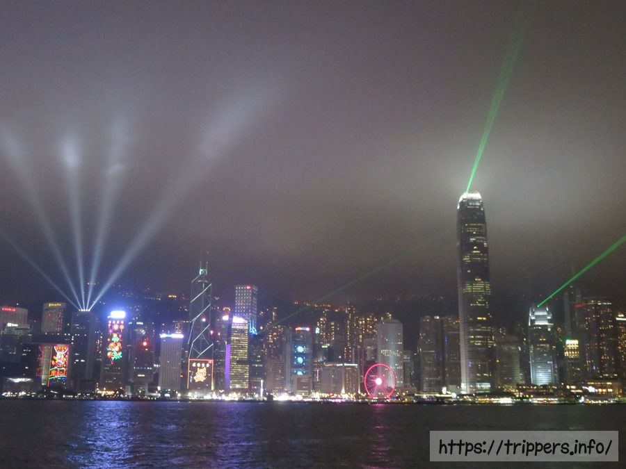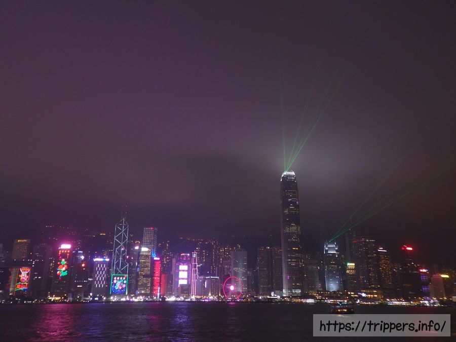 国際金融中心から放たれる緑色のレーザーが印象的なシンフォニー・オブ・ライツ。国際金融中心は香港で環球貿易広場に次いで高く地上415.8mの高さを持ち、世界で指折りの高さです。