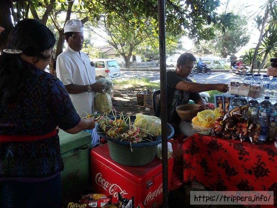 ゴアラワ寺院の正面入り口にある割れ門は現地人の礼拝用入口です。観光客は左にある入口で入場料IDR15000を払いサロン(腰布)とスレンダン(腰ひも)を借り、観光します。入場する前に、割れ門の右側で花のお供え物(チャナン)を捧げ、お祈りをしてから入場するのが一般的です。すぐ側にお供するチャナンが売っています。