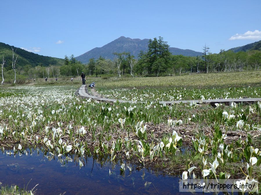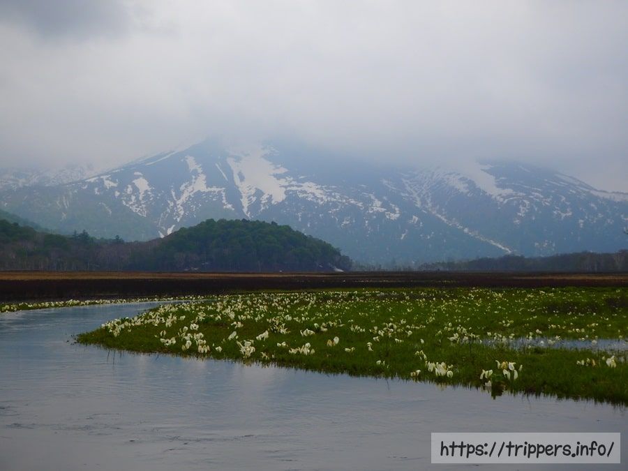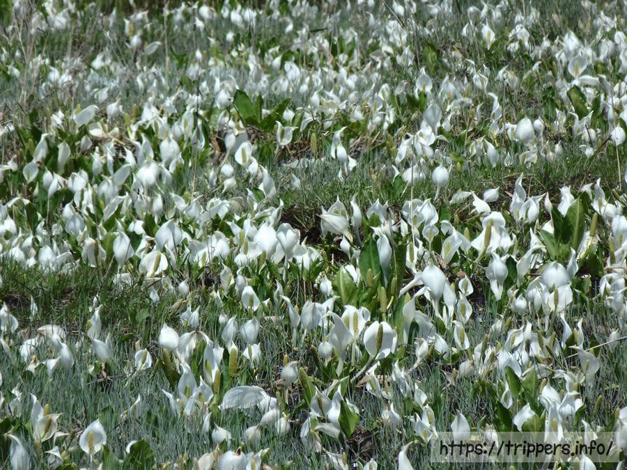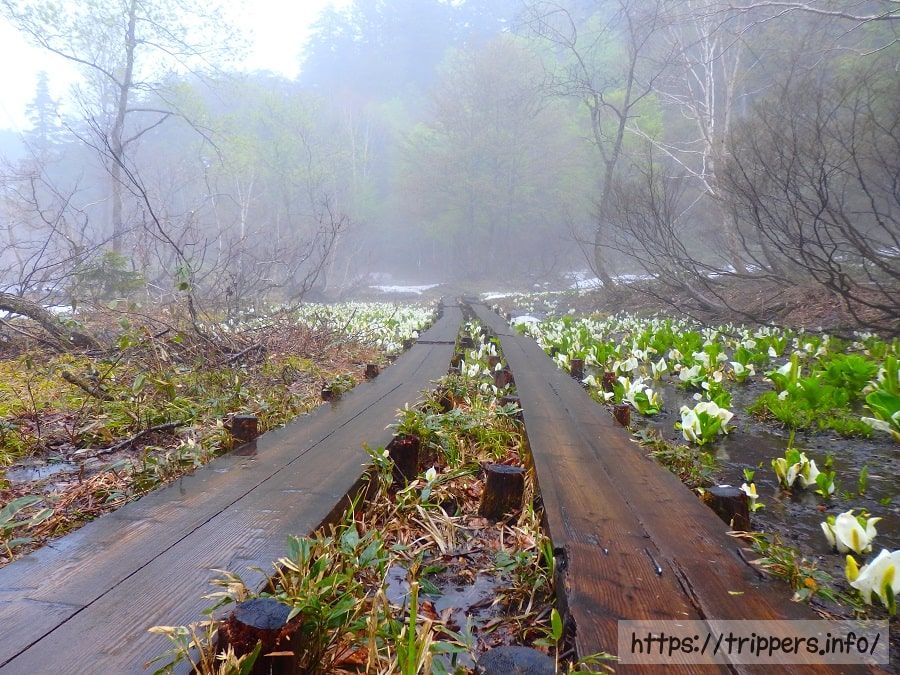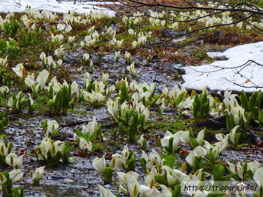 水源は雪解け水になっているため、ミズバショウの時期終盤は水量が少ない場合があります。その場合、ミズバショウが水面に咲いている風景ではなく畑に咲いているような風景になる可能性があります。