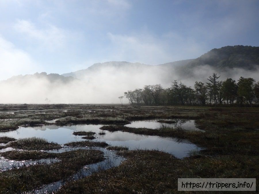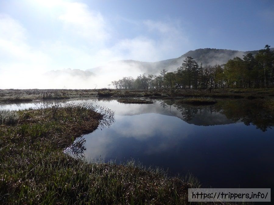 大量の水を含んだ尾瀬では、朝の放射冷却によって地面や池塘から霧が立ち込める事があり、朝霧と呼びます。