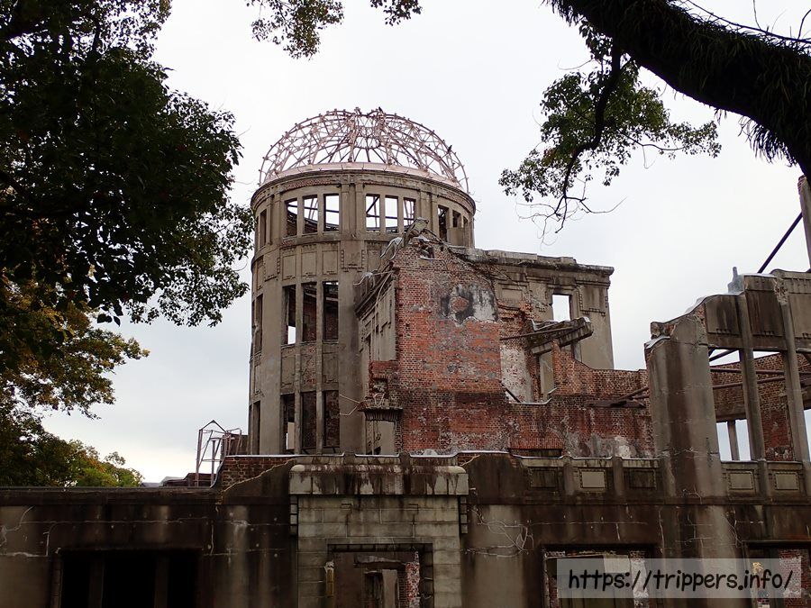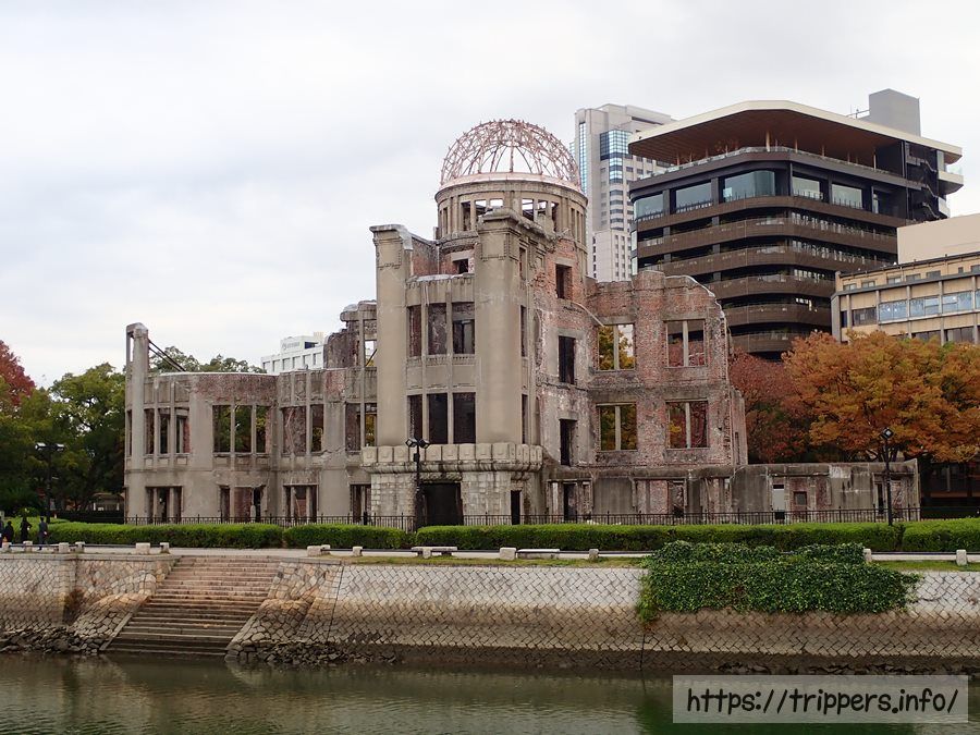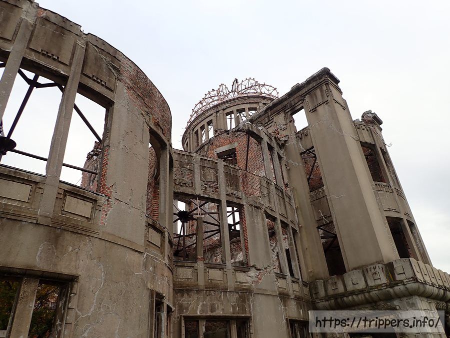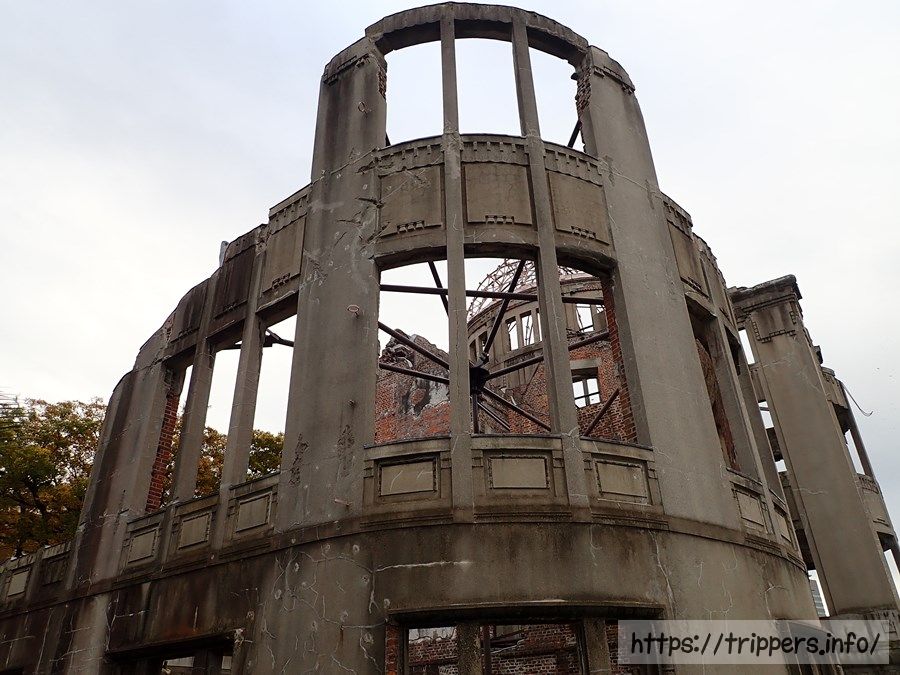 全体は3階建で、中央部分に5階建だった広島県産業奨励館です。第二次世界大戦中の1945年8月6日、史上初めて原子爆弾がこの建物の南東約160m、上空約600mで炸裂した事で破壊されました。館内にいた全員が即死しています。原爆の惨禍を全世界に伝えると共に、世界平和へ象徴として1996年12月、ユネスコの世界遺産に登録されました。爆風が真上から来たため、壁の一部は倒壊を免れ、保存工事によって現在の姿になっています。