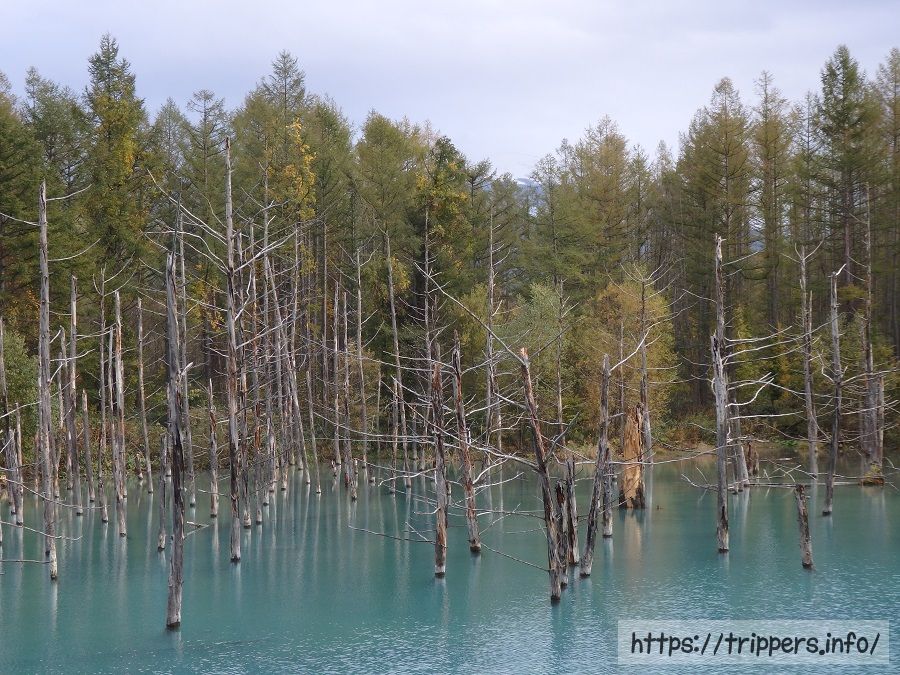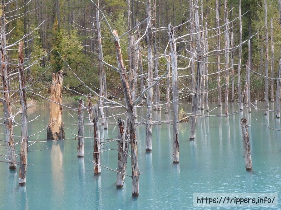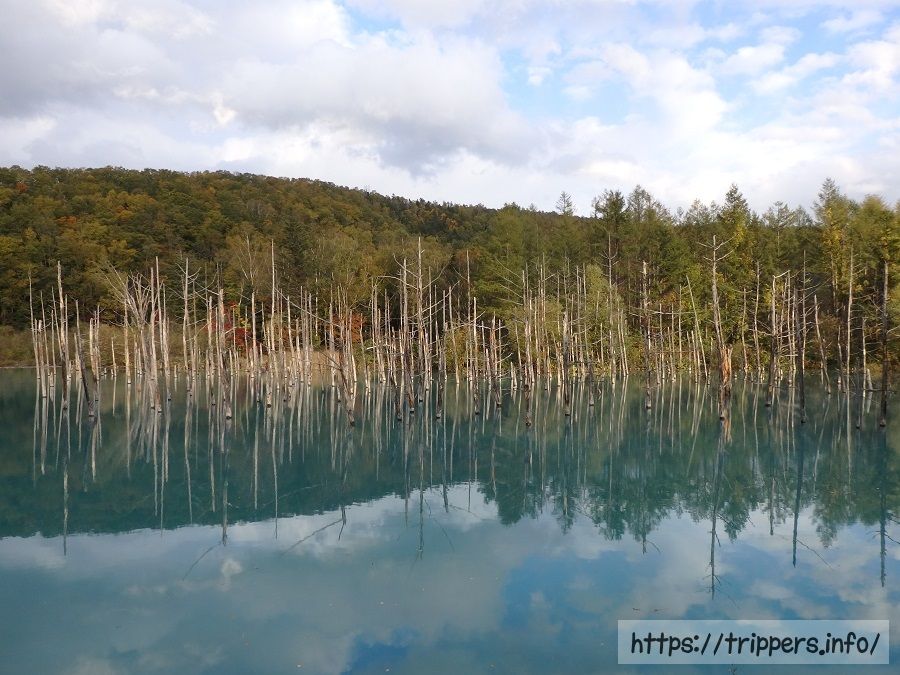 それ以外の季節は発色が綺麗な青い池を見ることが出来ますが、「風が無く・雨が降らず・晴天」であることが条件で、青い池に立ち枯れした木々と空が湖面に映った姿はとても美しいです。
