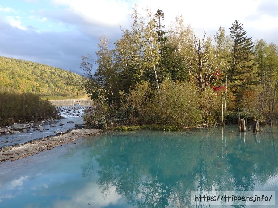 その水が美瑛川の水と混ざると目に見えないコロイド状という粒子が生成され、それが太陽の光をまんべんなく散乱させているため、青く見えます。