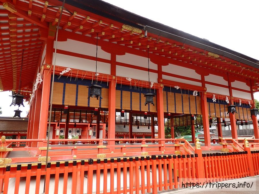 楼門は1467年に起きた応仁の乱によって、境内の建造物と共に焼失しました。その後、1589年になって再建されました。初代の楼門の創建年は不明です。1694年に移築され1694年に修繕され現在の姿になっています。重要文化財です。