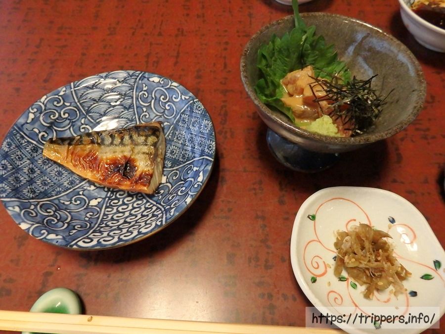 ①ゆば ②厚揚げとこんにゃくの煮物 ③湯豆腐 ④鯖の西京焼き ⑤マグロの漬け ⑥ごはんと味噌汁と香の物