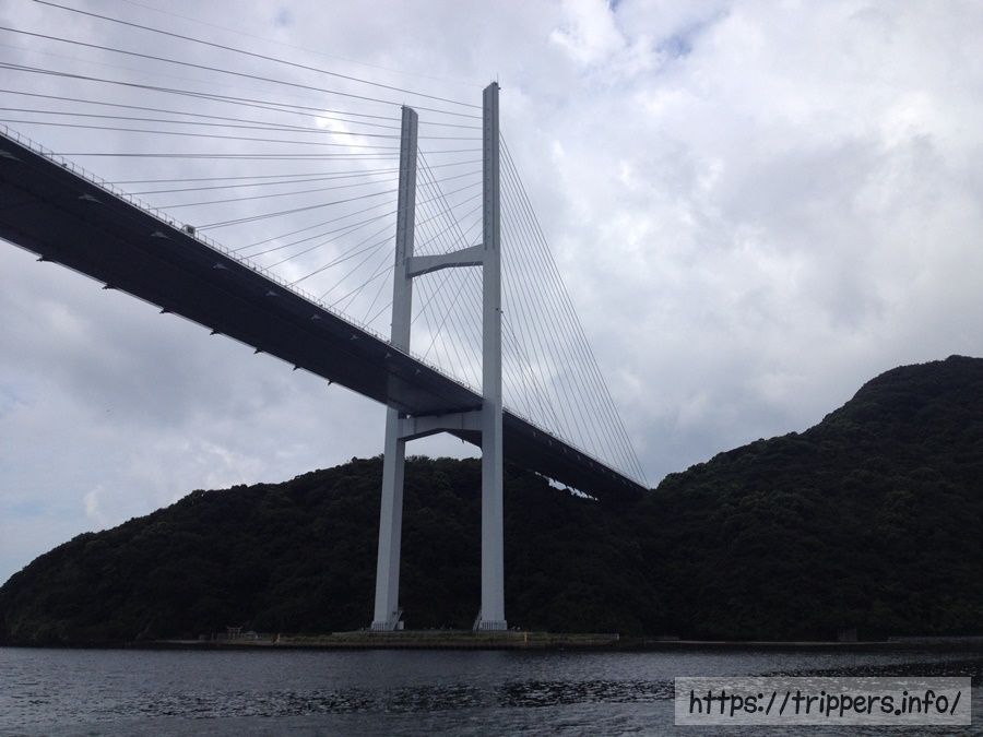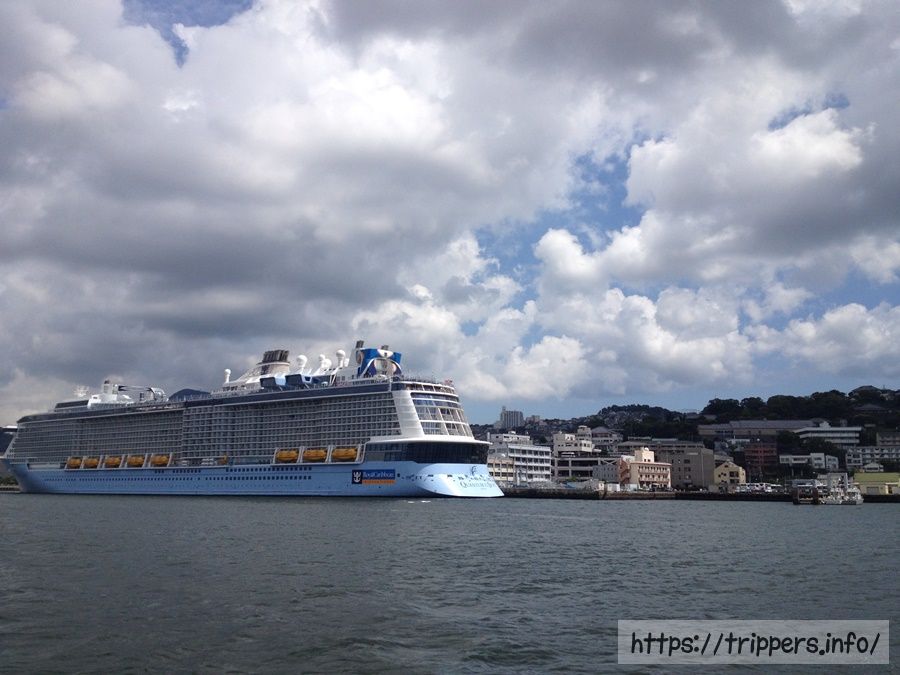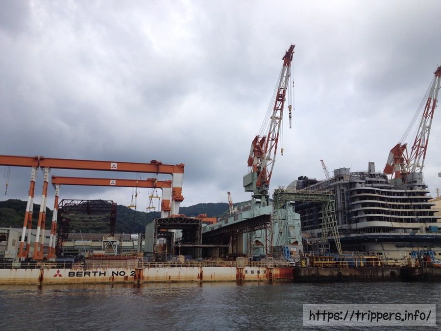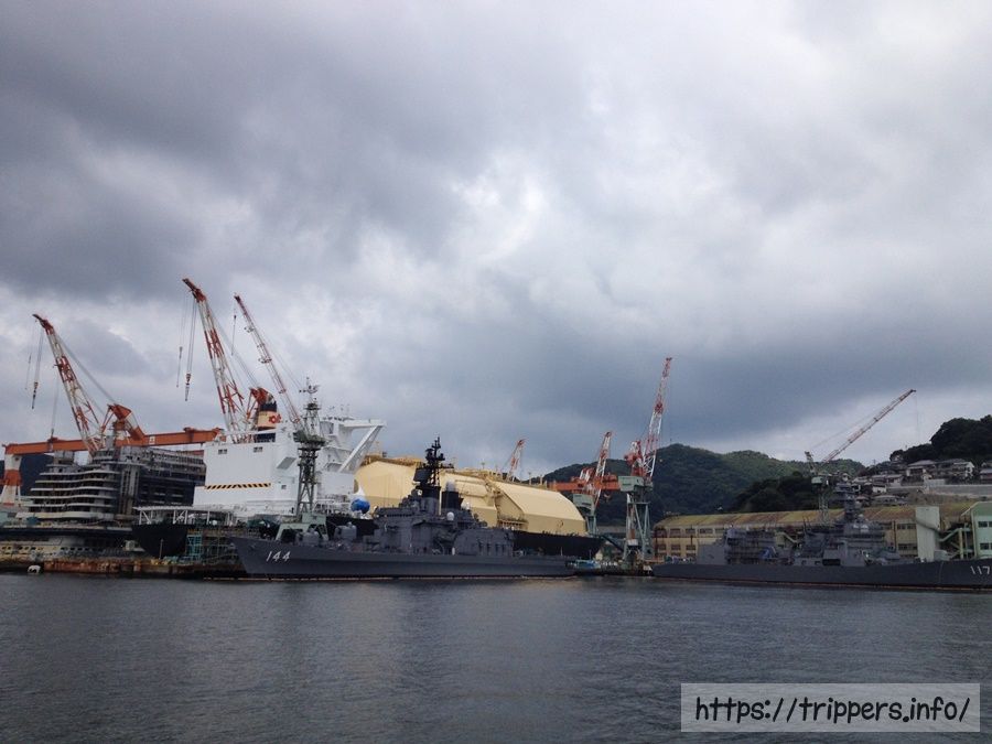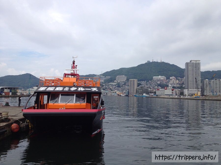 軍艦島クルーズ株式会社のクルーズ内容を紹介です。長崎港から乗船し出発。今回は高島よりも先に軍艦島へ向かいます。船の名前はブラックダイヤモンド。黒とオレンジ色の船が特徴です。このクルーズでは高島の軍艦島ミュージアムに立ち寄ります。
