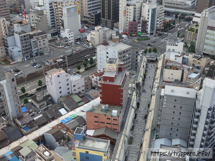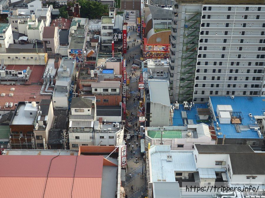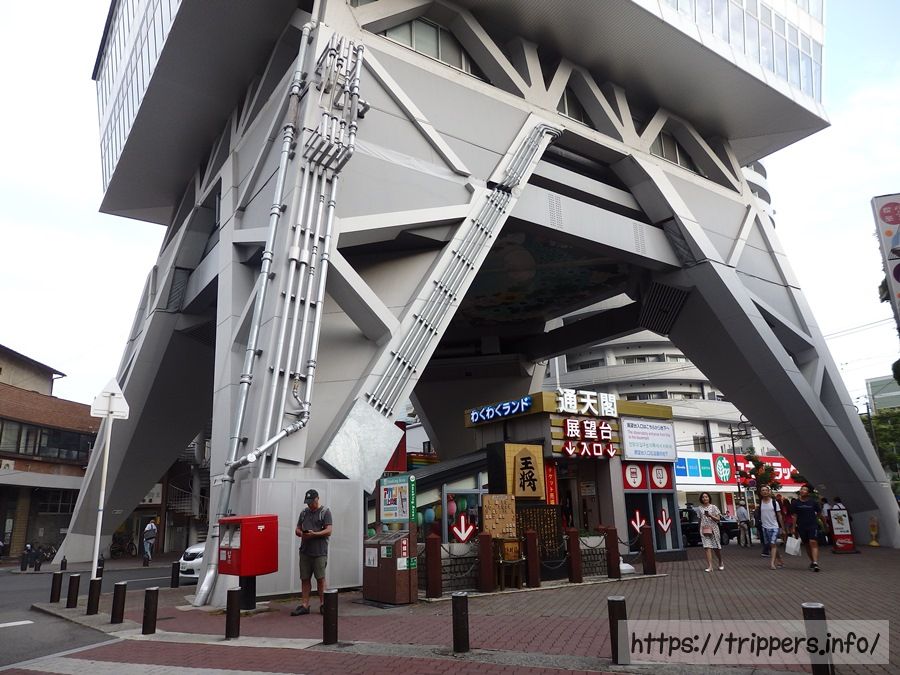 通天閣とは、新世界中心部に建つ展望塔で、大阪の観光名所になっています。現在は1956年に再建された2代目通天閣で国の登録有形文化財になっています。全長は108mあり、公式キャラクターは「ビリケン」です。館内は展望台の他に、日本庭園のような通天閣庭苑、様々なキャラクター、食品メーカーのアンテナショップから逆満載のお土産の販売まであります。初代通天閣は1912年に建設され、パリの凱旋門にエッフェル塔の上半分を乗せた姿でした。第二次世界大戦による火災で初代は解体されました。