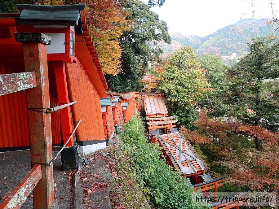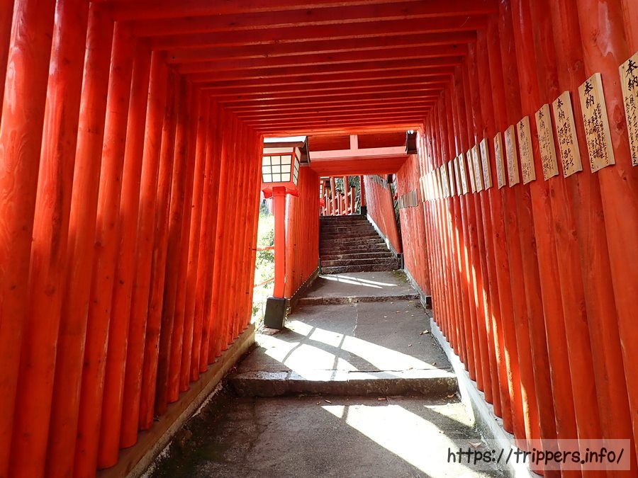 津和野の町から城山の方向を眺めると、朱色の鳥居が並んだ参道が見えます。傾斜を利用して建てられた鳥居の1つ1つが重なり隠れることなく、どこまでも続く紅い迷宮を思わせるような美しさが目立ちます。