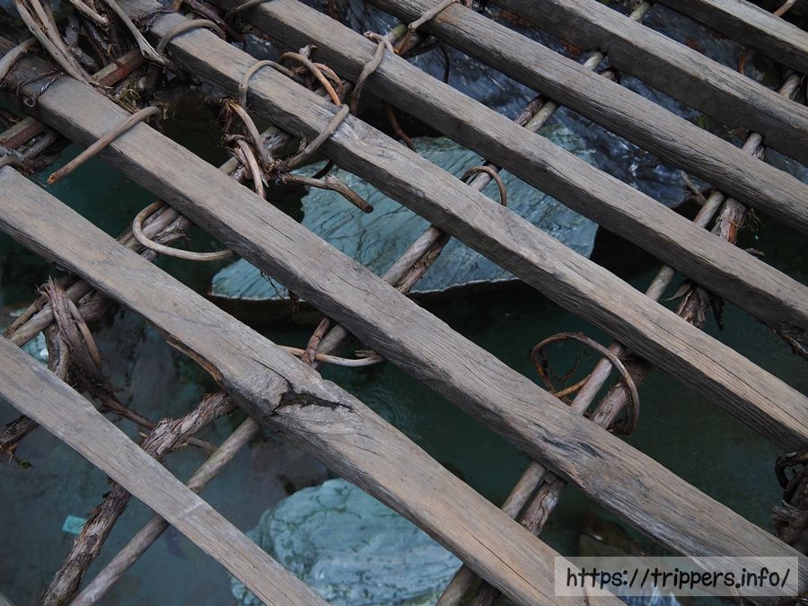 木の板は細く、もし折れたら...と考えてしまいます。板が置かれる間隔が広いため、足元が非常に不安定に感じ、手すりにつかまらず歩くのが難しいです。橋は一方通行で、観光客が前方にも後方にもいるため、一度渡り始めたらギブアップできません。