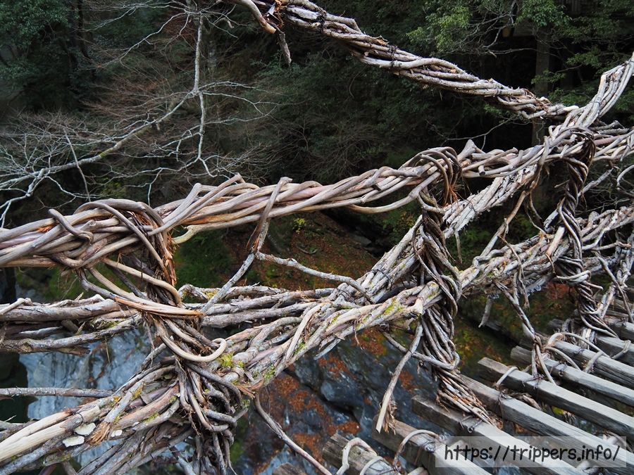 祖谷のかずら橋とは重さ約5トンもあるシラクチカズラ(サルナシ)を編み連ねて創られる原始的な吊橋で、幾つもあった祖谷のかずら橋の中で現存する数少ない1つです。長さ45m、幅2m、高さ14mあります。現在は安全のためワイヤーも使用されており、3年毎に架け替えが実施されます。祖谷のかずら橋の由来は、祖谷を訪れた弘法大師が困っている村人のために作ったという説や、源氏と平家の戦いで敗れ、追っ手から逃げ込んだ平家の落人が、追手が来た時に楽に切り落とせるようシラクチカズラで作ったという説が残っていますが、定かではありません。毎日19:00~21:30の間ライトアップされます。(渡橋はできません。)他に現存するかずら橋としては、奥祖谷二重かずら橋や福井県にある池田町のかずら橋があります。