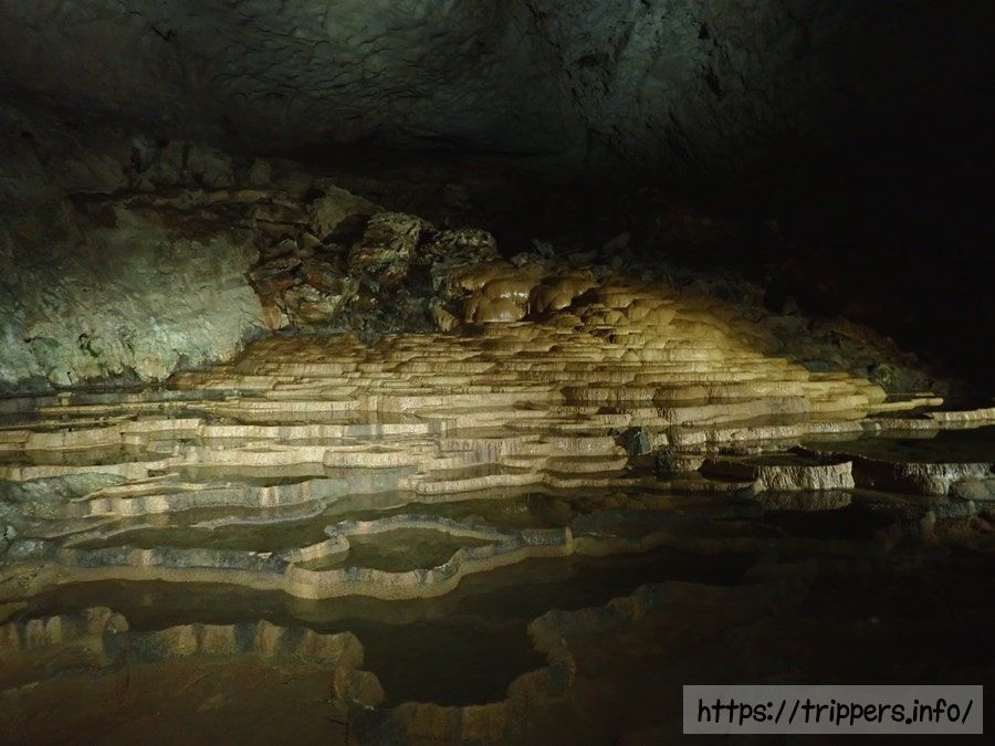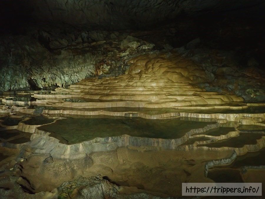 秋芳洞とは、日本最大のカルスト台地である秋吉台の地下100mに広がる、日本最大規模の鍾乳洞です。3億年もの年月をかけ、雨水により石灰岩台地が浸食を受けて造られました。鍾乳洞の総延長は10.7kmを越え国内第2位です。観光が可能なコースは約1kmあります。温度は一年を通して約17℃と一定しています。棚田状のリムストーンプール(畦石池)の中には、シコクメクラヨコエビ、ニホンヨコエビ、アキヨシミジンツボ、カニなどの水棲生物が生息しています。秋吉台地下水系としてラムサール条約に登録されています。