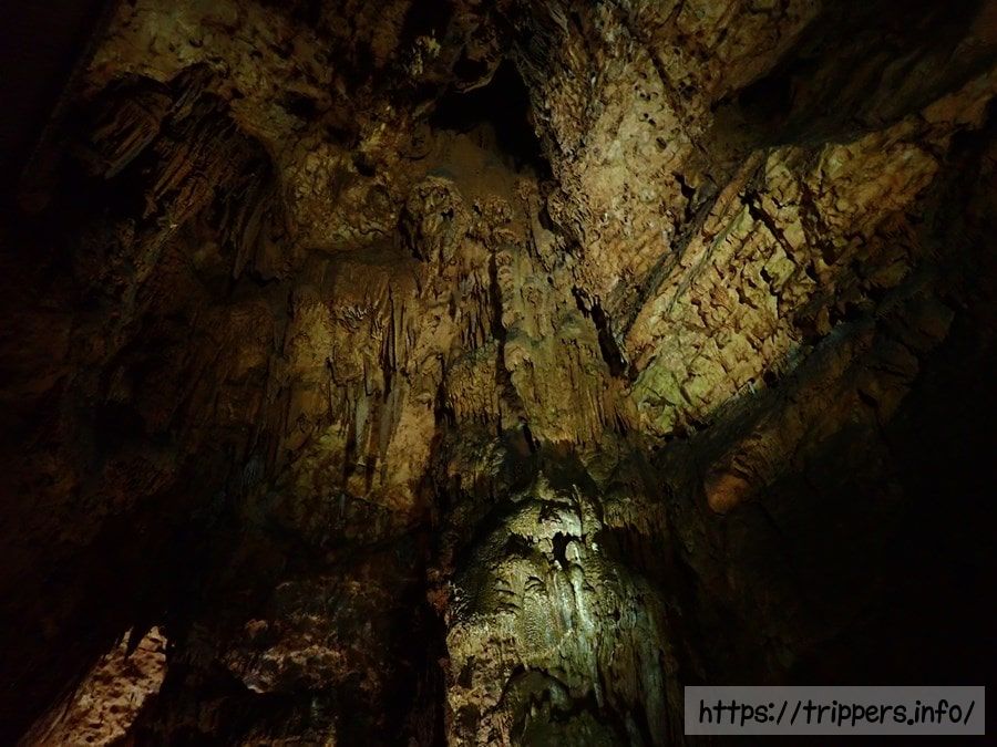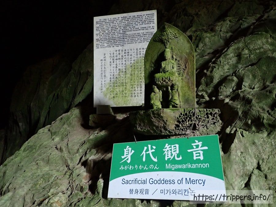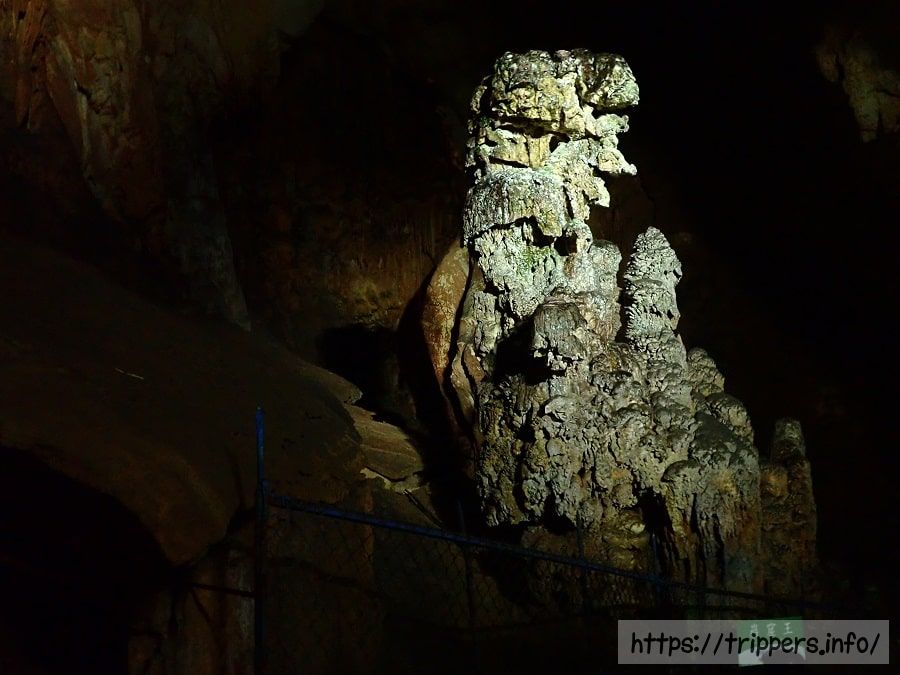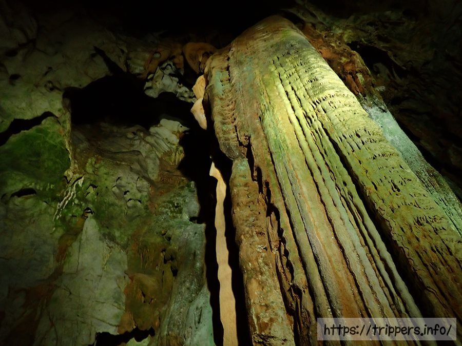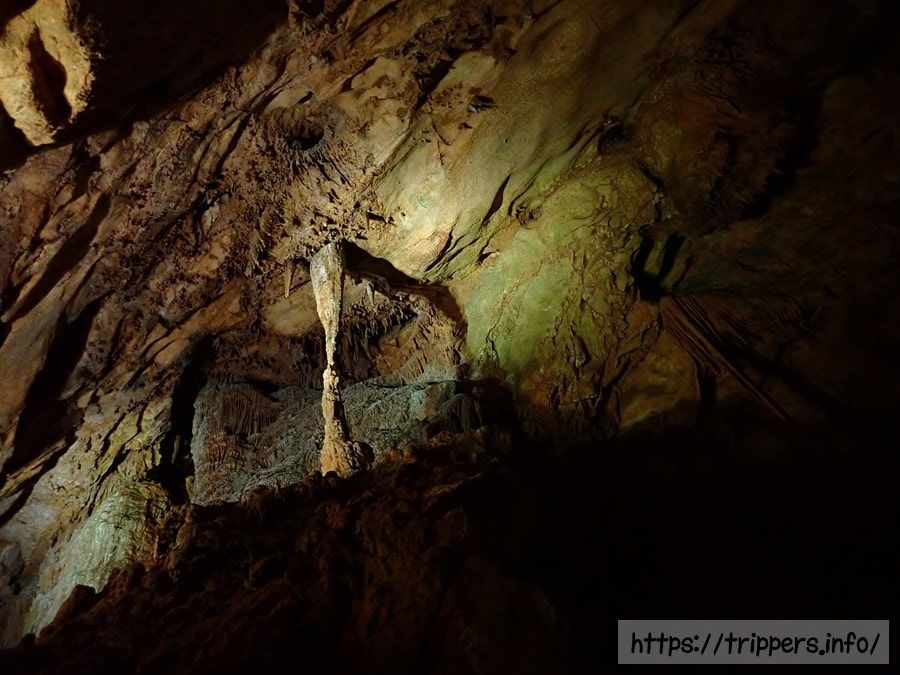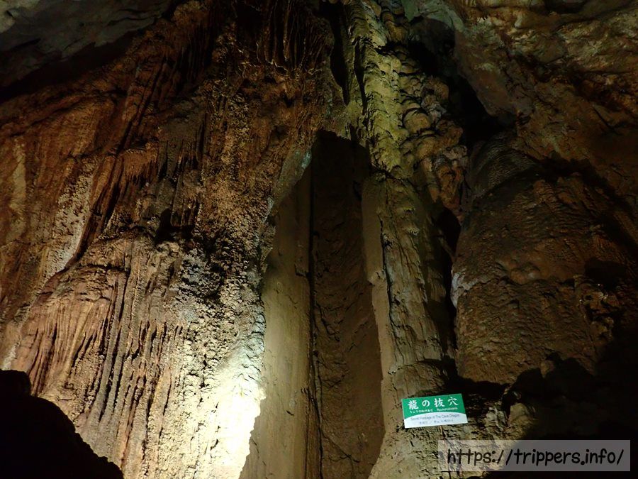 洞内富士:直径約5mの巨大な石柱です。裾広がりとなった姿は富士山のようです。黄金柱:天井近くの岩の隙間から流れ出た地下水が作り出したフローストーン(流華石)です。根本近くに、地盤沈下による亀裂があります。