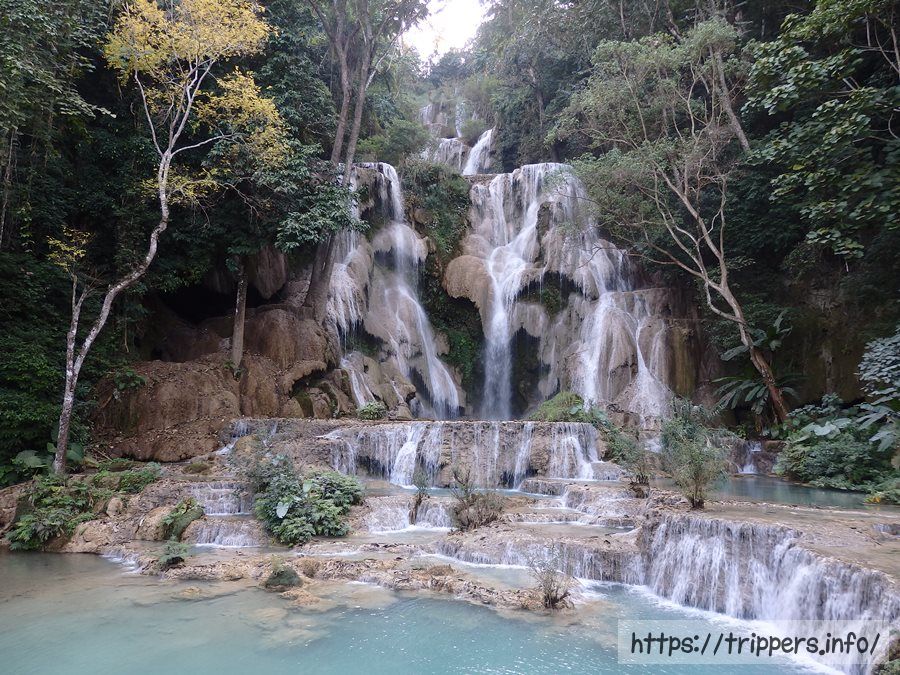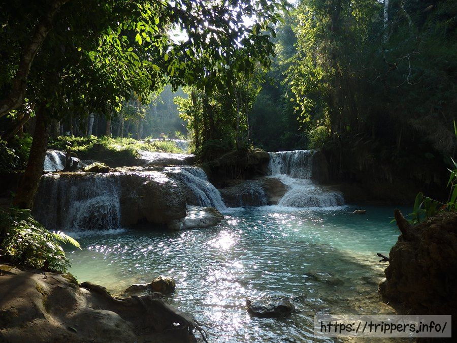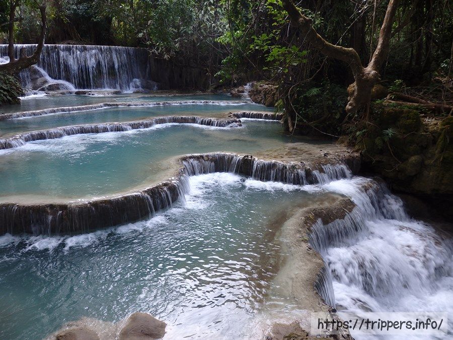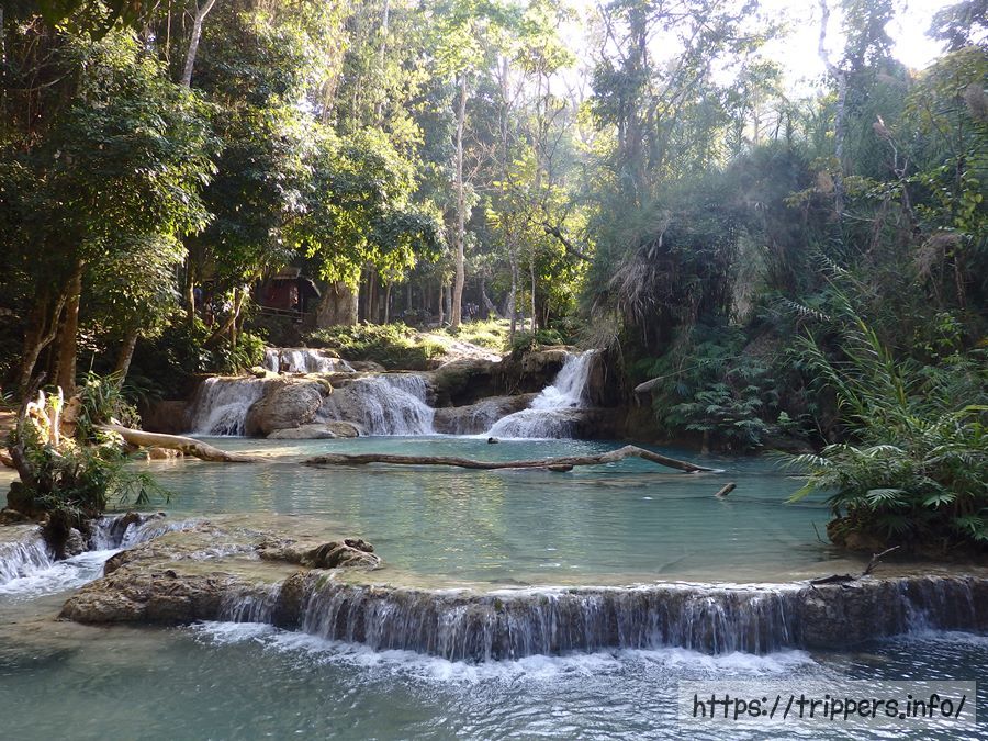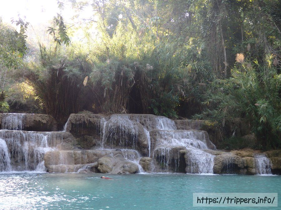 クアンシーの滝とは、ルアンパバーン市内から南に約30km程はなれた場所にある滝です。幾つもの滝が連なる遊歩道の奥に3層からなる落差50mの滝があります。山道を登って滝の一番上まで行く事が出来ます。カルスト地形によって石灰分を含んだ水が流れ落ちながら無数の石灰華(石灰棚)が造形されました。滝壺での水浴が観光客に人気です。水中に溶け込んでいる太陽の光と石灰分によっ水がエメラルドグリーンに見えます。敷地内にはツキノワグマ保護センターがあり、ツキノワグマを観察する事が出来ます。