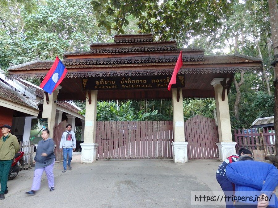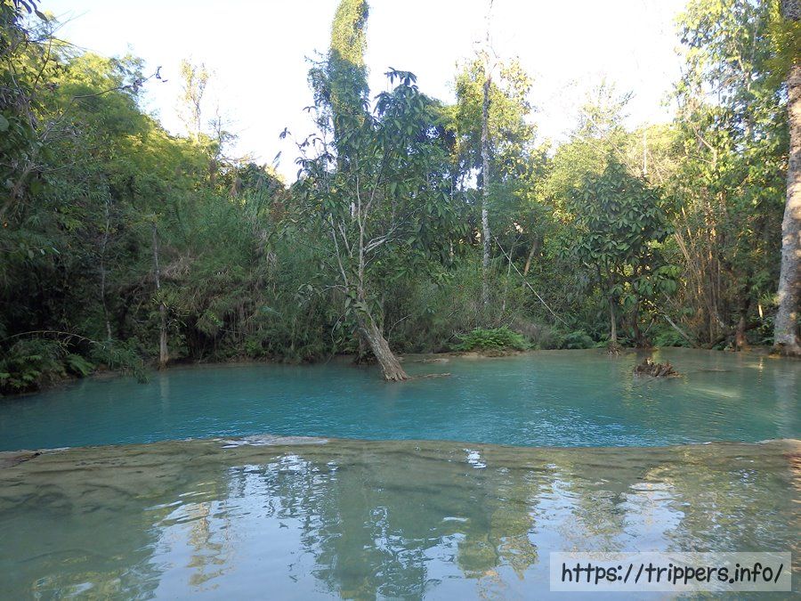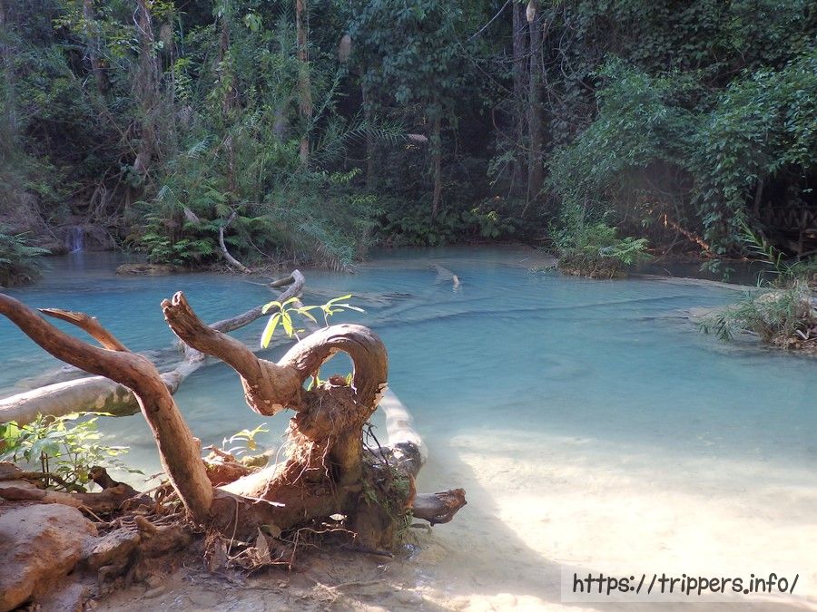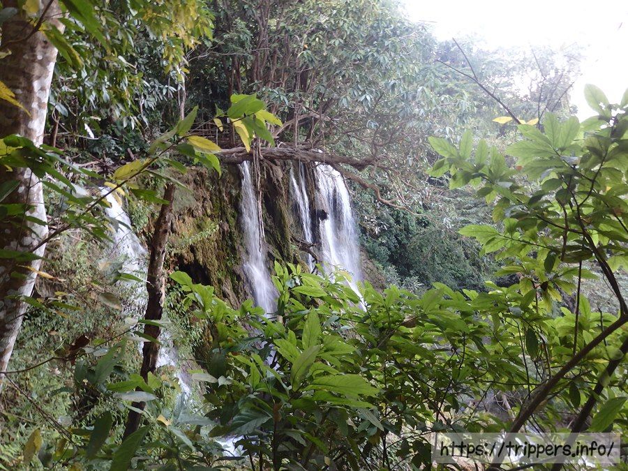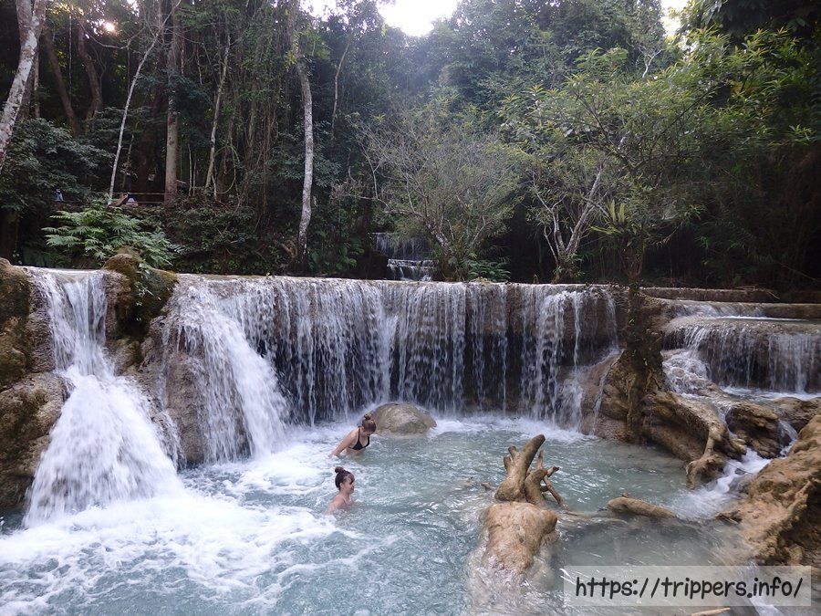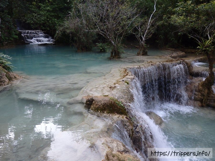 クアンシーの滝とは、ルアンパバーン市内から南に約30km程はなれた場所にある滝です。幾つもの滝が連なる遊歩道の奥に3層からなる落差50mの滝があります。山道を登って滝の一番上まで行く事が出来ます。カルスト地形によって石灰分を含んだ水が流れ落ちながら無数の石灰華(石灰棚)が造形されました。滝壺での水浴が観光客に人気です。水中に溶け込んでいる太陽の光と石灰分によっ水がエメラルドグリーンに見えます。敷地内にはツキノワグマ保護センターがあり、ツキノワグマを観察する事が出来ます。