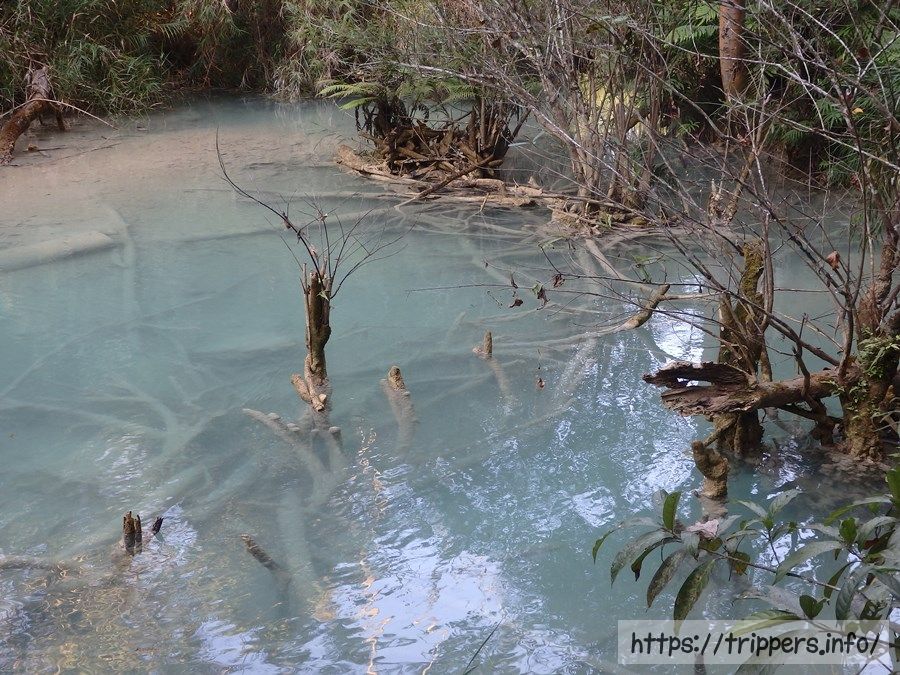 ここでは泳ぐことが出来ません。他の滝と異なるのは落差が激しいだけでなく、水の流れる方向に沿って石灰成分が大きく成長し続けている事です。これは鍾乳石が成長する原理と同じです。それによって普通の滝では見る事の出来ない独特の姿をしています。