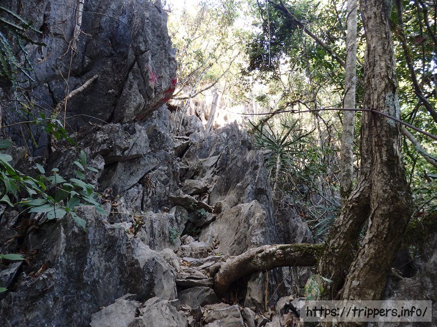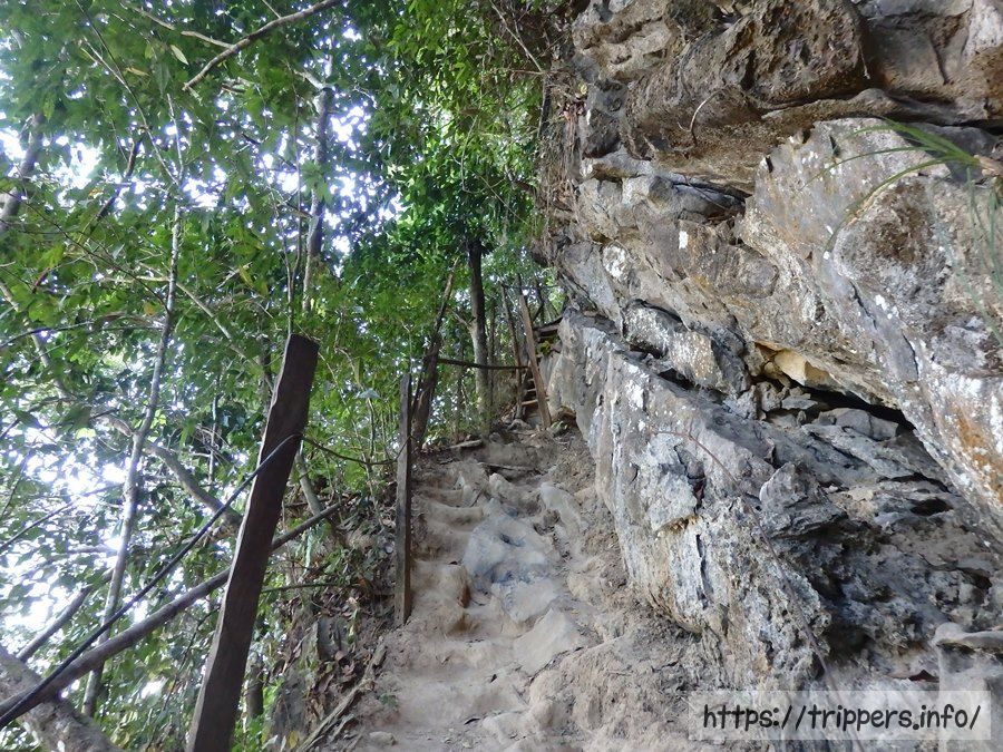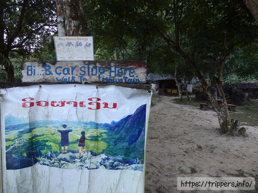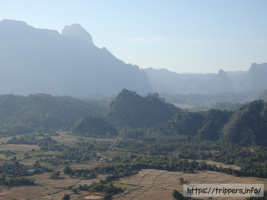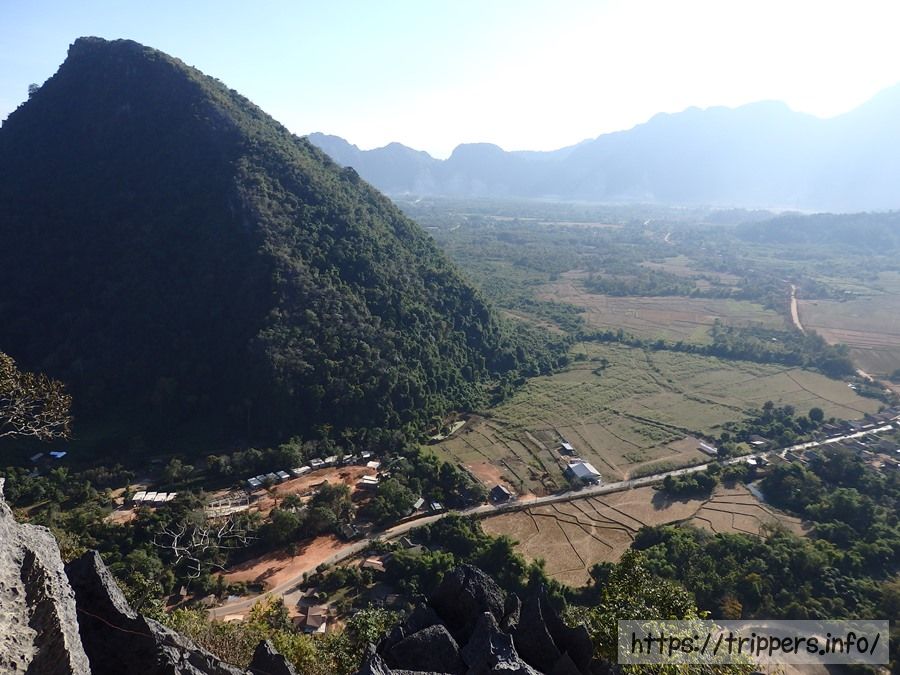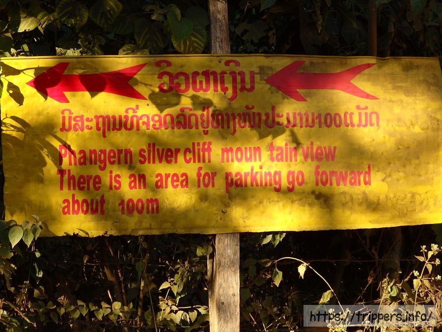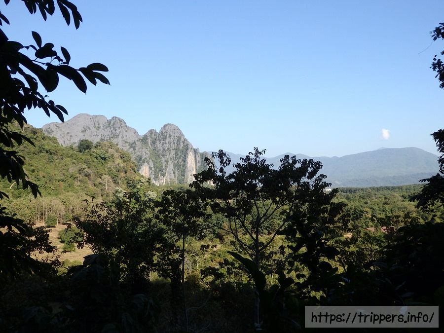 ファンギャンとは、バンビエンのカルスト地形にある山の崖で展望台になっています。ファ・ンギャンには3つのビューポイントがあり、シルバークリフ(Silver Cliff)は他の2つとは別の登山口です。3つともトレイルロードで繋がっています。他の2つは同じ登山口から行けるPha Ngern ViewpointとPha Ngern Cliff View Point 2です。View Point 2は2つの展望箇所があります。登山口から山頂までの時間は30分です。登山道は急な登りが続きますが、整備されています。山頂付近はナイフのように鋭利な石灰岩になっています。