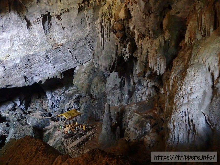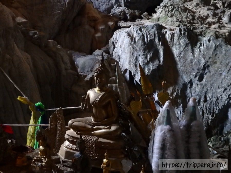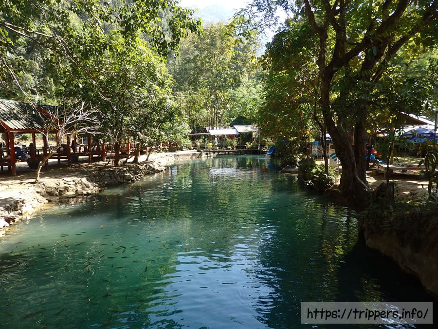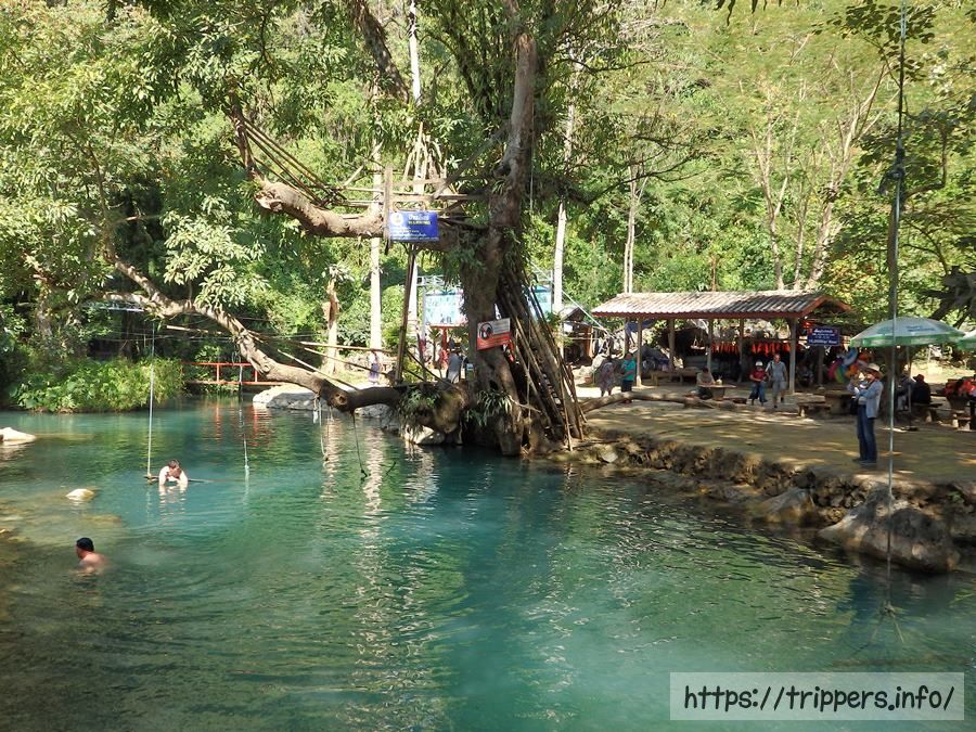 ブルーラグーンは複数ありますが、バンビエンの街から一番近い場所にあるのがブルーラグーン1です。同じ場所にタム・プーカム洞窟があります。ブルーラグーンはエメラルド色の水泳可能な池です。ターザンのように綱につかまって飛び込んだり、高飛び込みが出来ます。他にジップラインもあります。タム・プーカム洞窟はライトアップされておらず、自然の日光だけで照らされた鍾乳洞です。涅槃仏が安置されています。奥に行くと完全に真っ暗になりますが、その先も続いています。