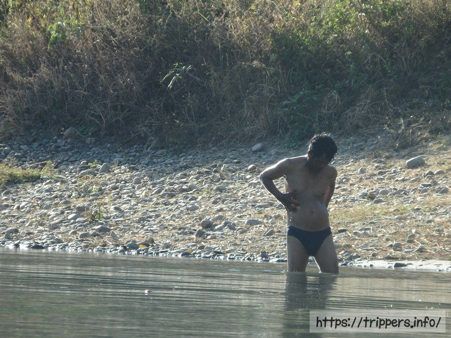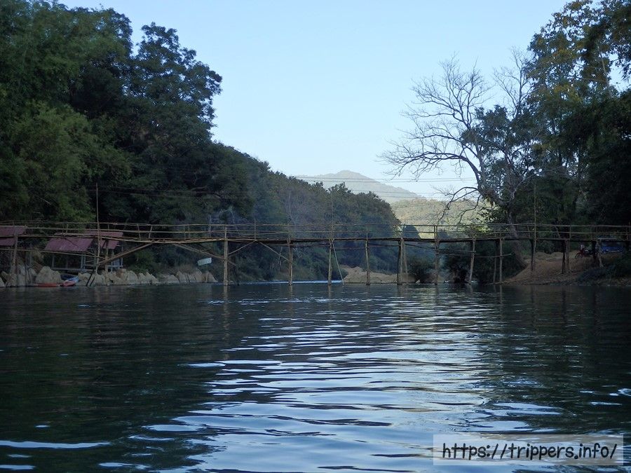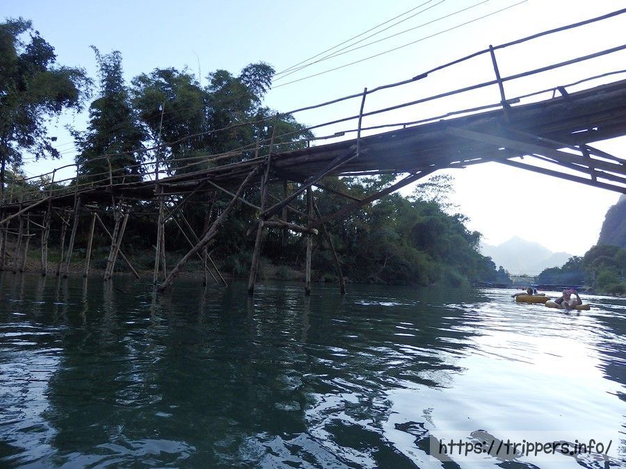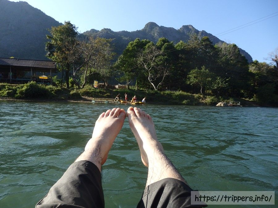 防水バッグを抱え、サンダルはライフジャケットの紐に括り付けました。乾季の寒い時期でしたが、流れはゆっくりで水温は温かいです。水深が浅いため足を水中に入れると足に岩が当たり痛いです。チュービング中にやる事は特になく流されるだけですが、手足を使って舵を取ると流れに乗れます。何もしないと漂着したり障害物につっかえます。