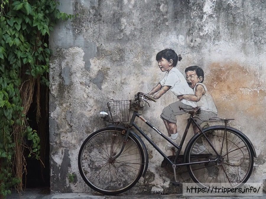 ペナン島ジョージタウンには数々のウォールアートが存在します。世界遺産エリアにある古い建物や壁に描かれた壁画は、ストリートアートとしてフォトジェニックな観光スポットになっています。作品の中には、実物の自転車やバイク、ブランコが設置され、絵と一体となっています。