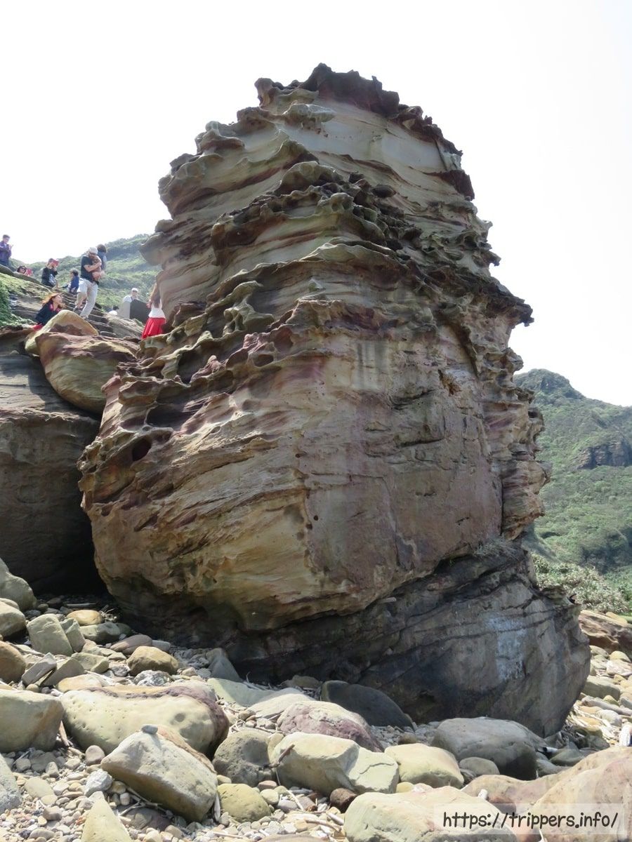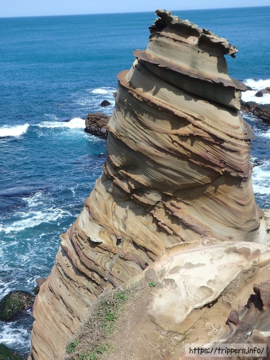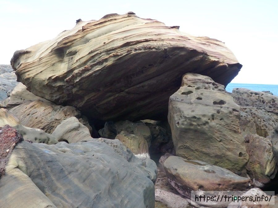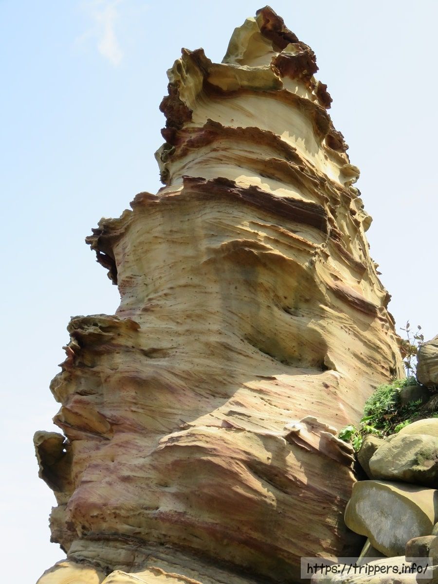 海流と波、雨による浸食作用と風化により岩石が浸蝕されてできた奇岩。南雅海岸にあります。岩石は硬い砂岩で、硬度と厚さの違いで浸蝕スピードが異なり、岩石の表面に凹凸ができます。また雨や海水の浸蝕を受け砂岩の内部に含まれる鉄鉱が徐々に酸化し、風化によって表面に酸化鉄が浮き出た結果、帯状の模様が出現しました。