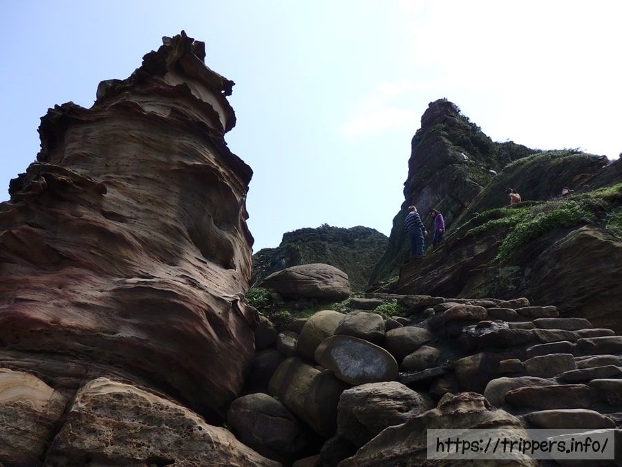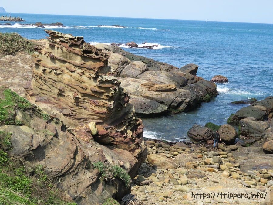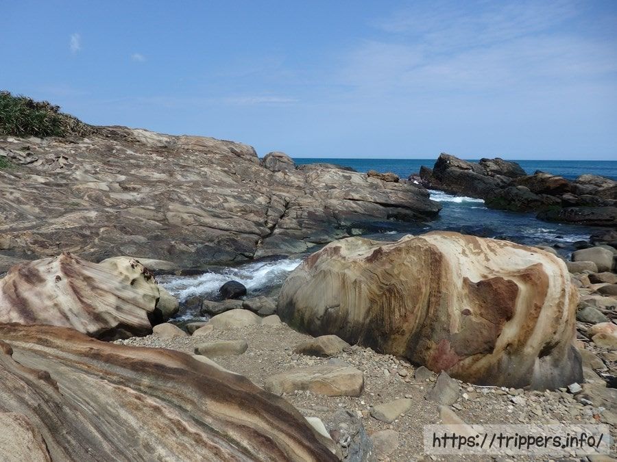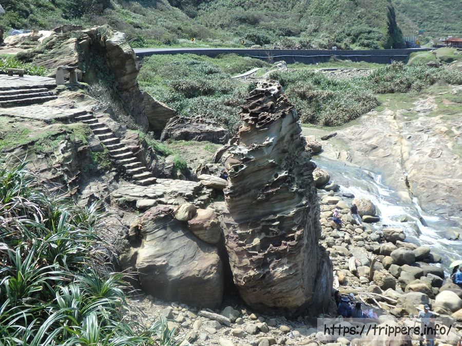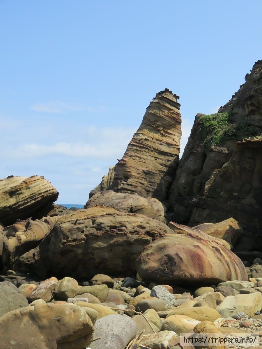 海流と波、雨による浸食作用と風化により岩石が浸蝕されてできた奇岩。南雅海岸にあります。岩石は硬い砂岩で、硬度と厚さの違いで浸蝕スピードが異なり、岩石の表面に凹凸ができます。また雨や海水の浸蝕を受け砂岩の内部に含まれる鉄鉱が徐々に酸化し、風化によって表面に酸化鉄が浮き出た結果、帯状の模様が出現しました。