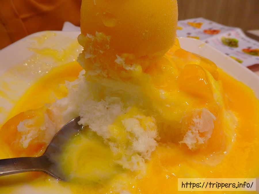マンゴーシャーベット付の新鮮なマンゴーと練乳の台湾式フワフワかき氷。