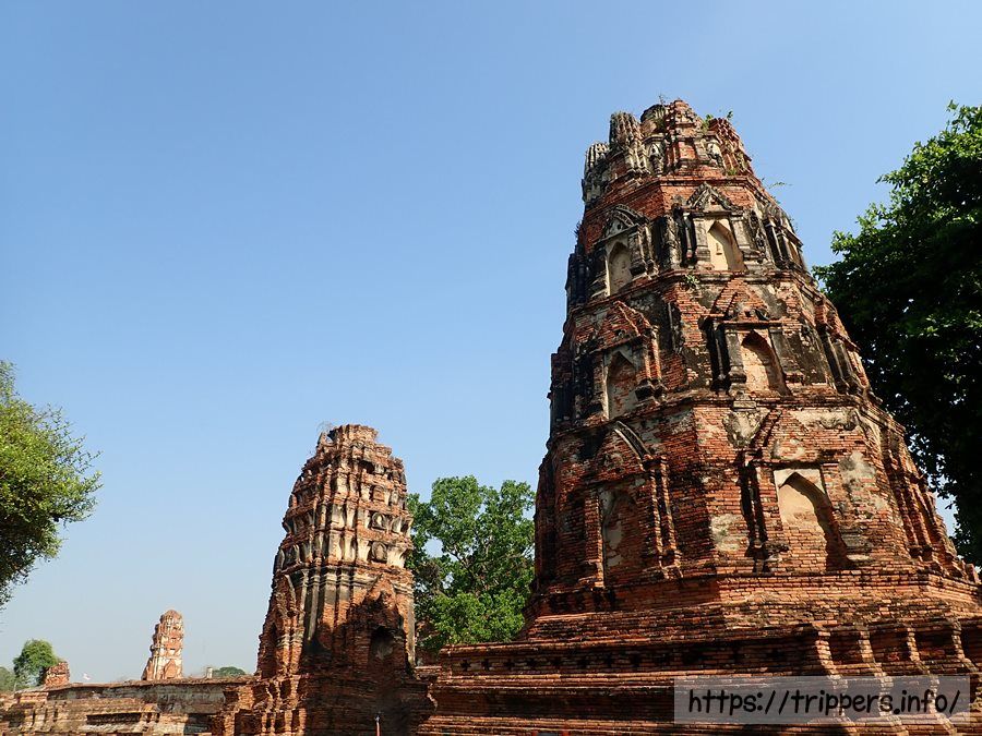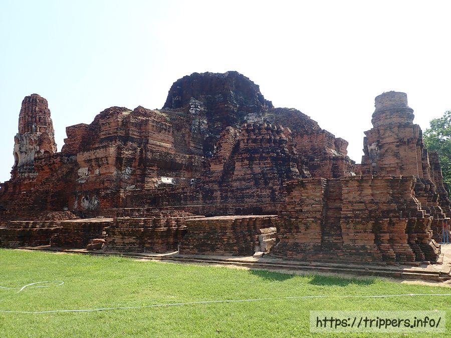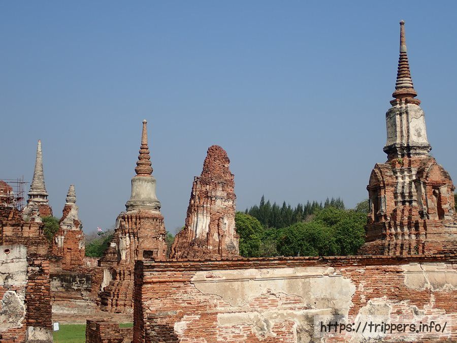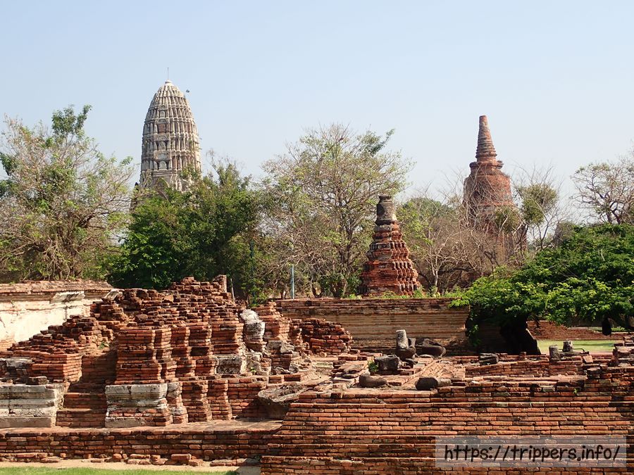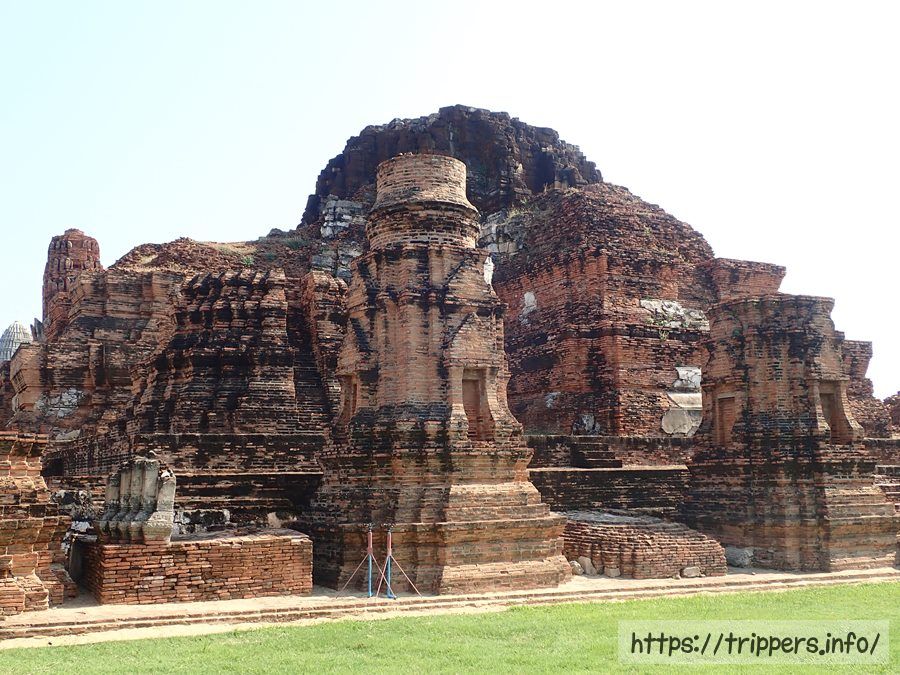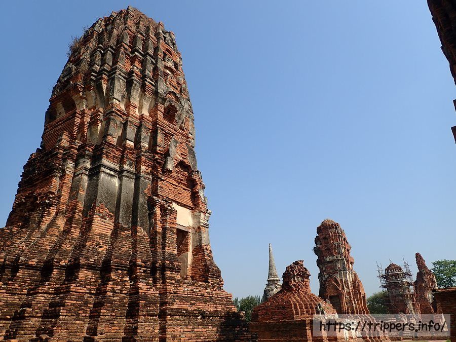 中央の仏塔の上部がソンタム王の時代(1611~1628年)に朽ちて崩れ、1633年にプラーサートトーン王によって修復されました。その時、高さは44mまで高くなりましたが最終的には50mまでになりました。ボーロマコート王の時代(1733~1758年)に再度修復され、中心の仏塔に4つの柱列(ポルチコ)が付け加えられました。その後でビルマの攻撃されて破壊されます。