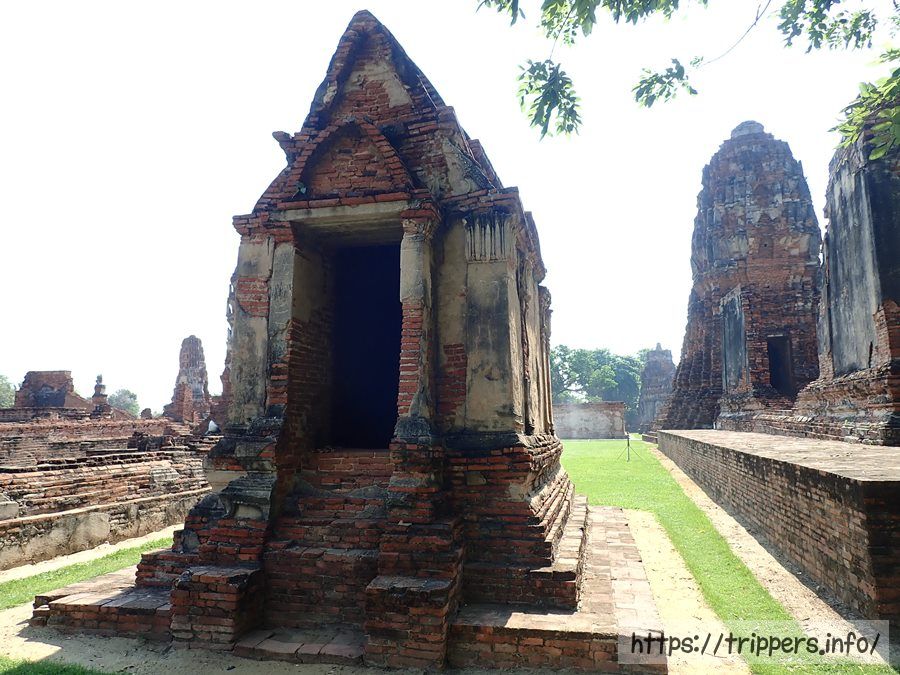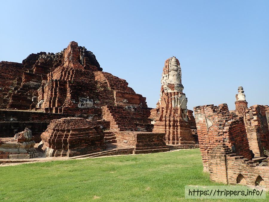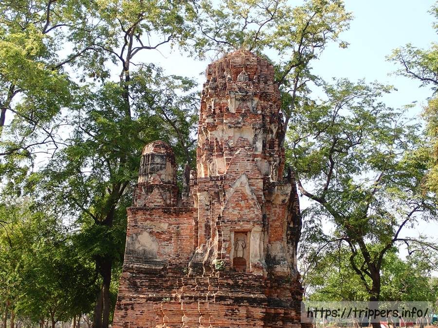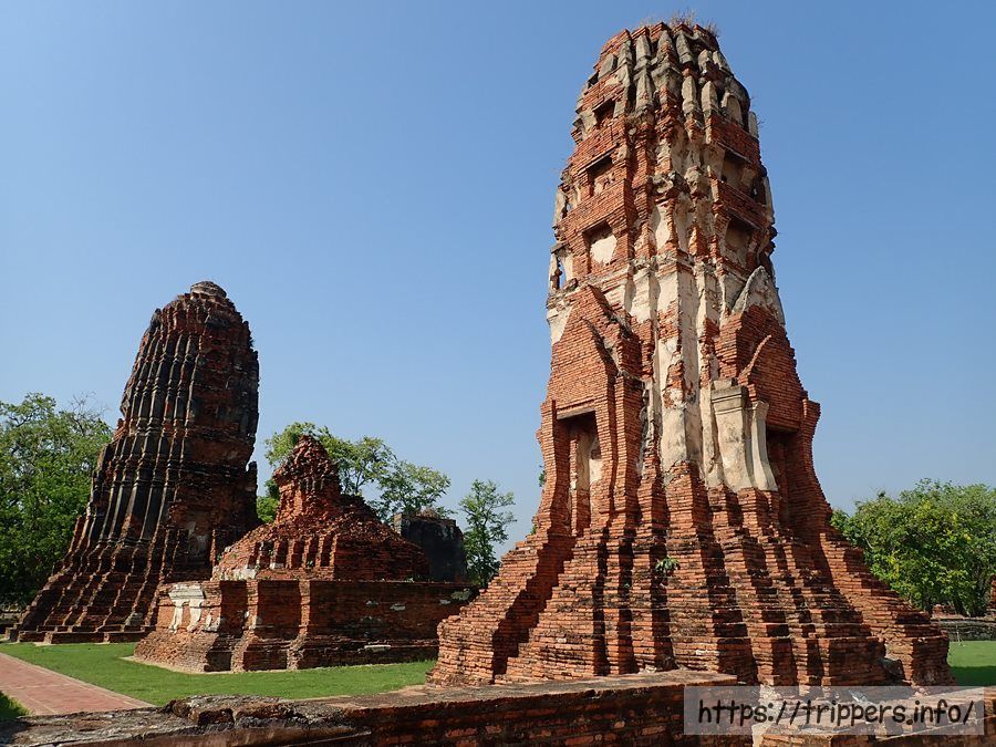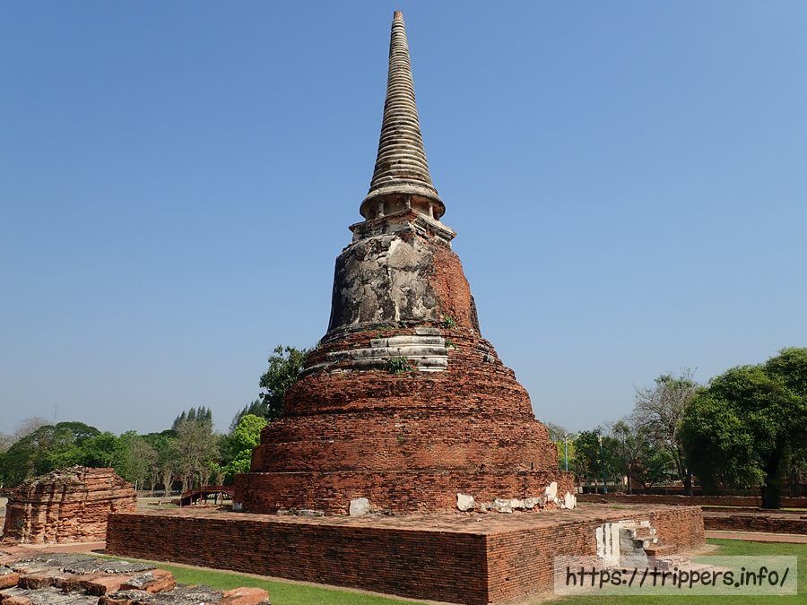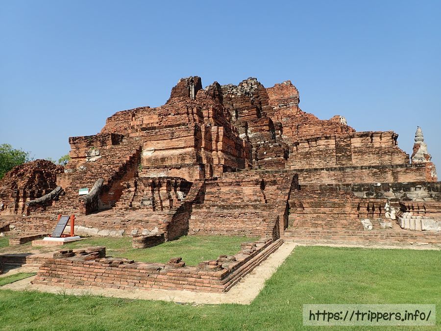 中央の仏塔の上部がソンタム王の時代(1611~1628年)に朽ちて崩れ、1633年にプラーサートトーン王によって修復されました。その時、高さは44mまで高くなりましたが最終的には50mまでになりました。ボーロマコート王の時代(1733~1758年)に再度修復され、中心の仏塔に4つの柱列(ポルチコ)が付け加えられました。その後でビルマの攻撃されて破壊されます。