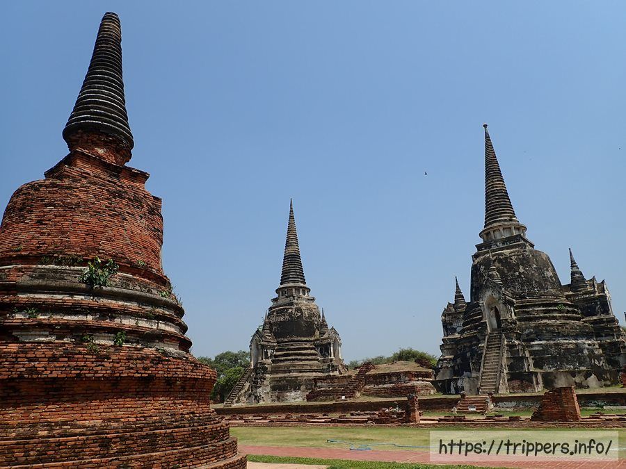 アユタヤ王朝にあった王宮の中で重要な守護寺院でした。9~11代王(父とその息子2人)の遺骨が納められている3つの仏塔は、鐘を彷彿とさせるセイロン様式で建てられています。バンコクにある寺院ワット・プラケオはワット・プラシーサンペットをモデルに建てられています。仏塔の中に立ち入ることはできません。