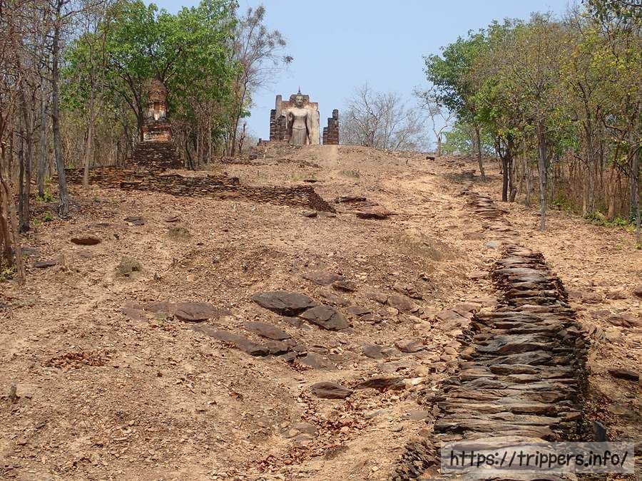 スコータイ歴史公園の城壁の西に位置する寺院遺跡です。標高200mの丘の上に、厚いレンガ造りの壁を背にした高さ12.5mの仏立像が立っています。仏立像はプラ・アッタロット(Phra Attharot)と呼ばれています。サパーンヒンは「石橋」の意味があり、距離が300mある石畳の道を上って行きます。丘の頂上からは眺望があり、スコータイ王朝の3代君主のラームカムヘーン大王は満月や新月の時、白象に乗ってこの寺院を参拝していたと記述が残されています。ワット・サパーンヒンから南西に約500m離れた場所にはワット・アラニクと呼ばれる寺院があります。スコータイで発見された石碑文には、ワット・サパーンヒンを「ワット・アラニィク」と呼んでいたとあるため、当時は単一の寺院であったと考えられます。