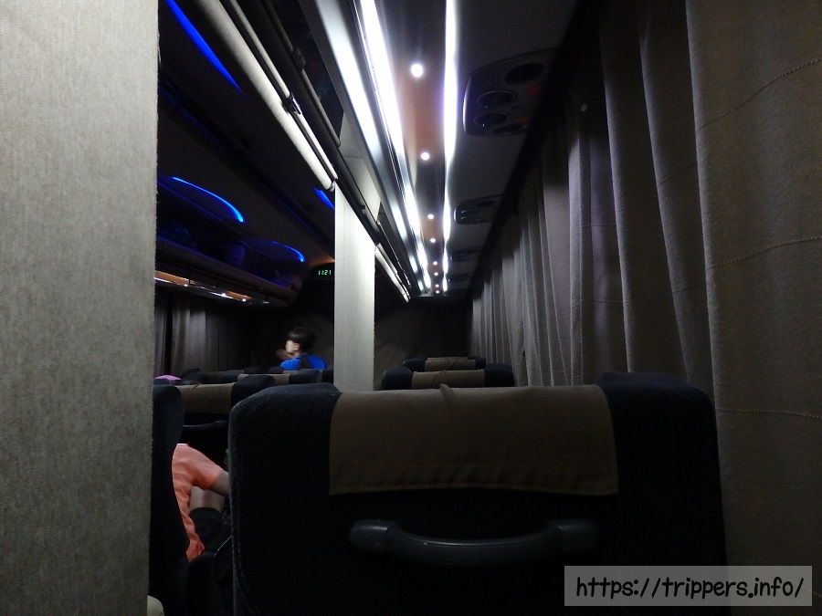 それにしても、3列バスの1列席はとても快適。カーテンでプライバシー保護可能なんですね。