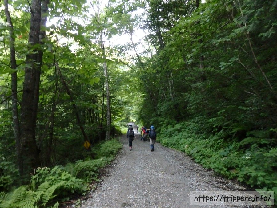 新穂高温泉から笠新道登山口まで約1時間の林道ハイキング。それにしてもリュックがとても重たいです。水場が登山口しかないので、どれだけ水を持ってくれば良いか分からず、3750ML(650ML×お茶5本、500ML×ミルクティー1本)を持ってきました。事前にネットで正しいリュックの詰め方を調べてきましたが、重いったらありゃしない。テント泊用の道具がないだけでも楽なはずなんですけれども、日ごろの運動不足を実感。
