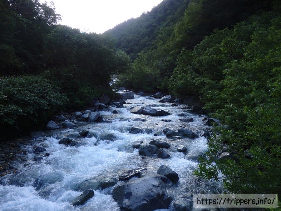 林道脇の川。朝日がまだ高く登っていない状態ですが、とても青くて綺麗でした。