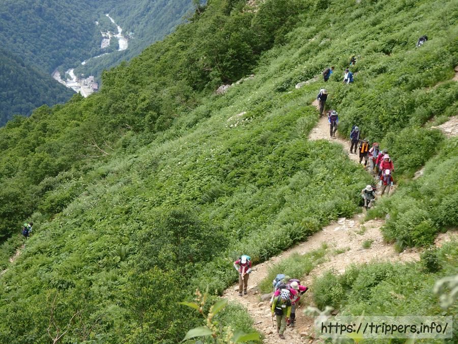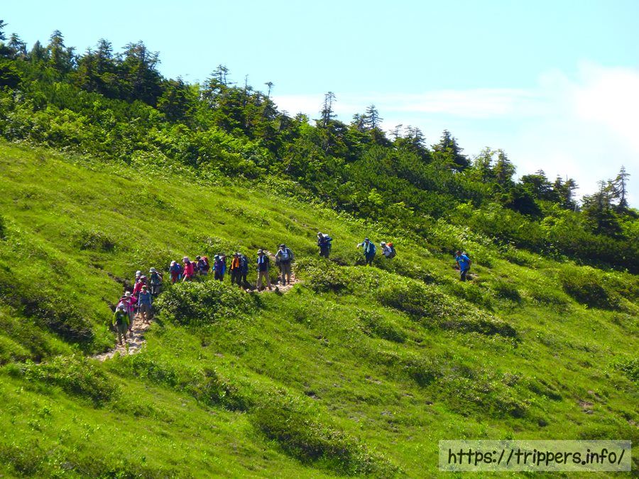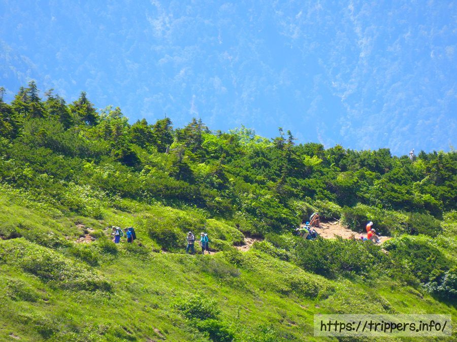 先程後ろを登っていた人々が杓子平に到着し、休憩を始めたので出発する事にしました。