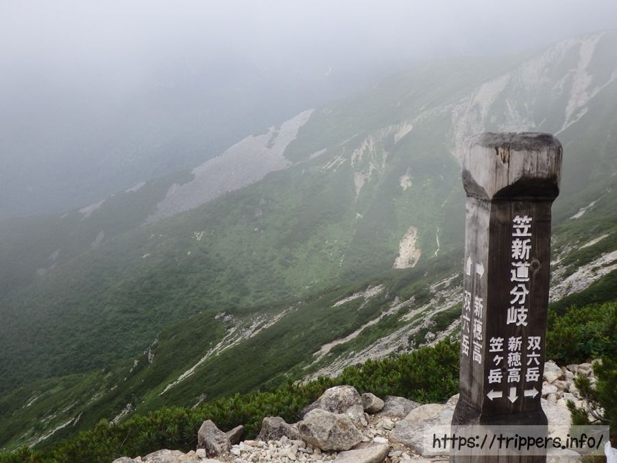 11:22に笠新道分岐に到着。ここまで、どこまでも登りでした。おかげさまでただ今の標高は2,760m。山荘との標高差は60mくらいです。ここからは尾根に突入。