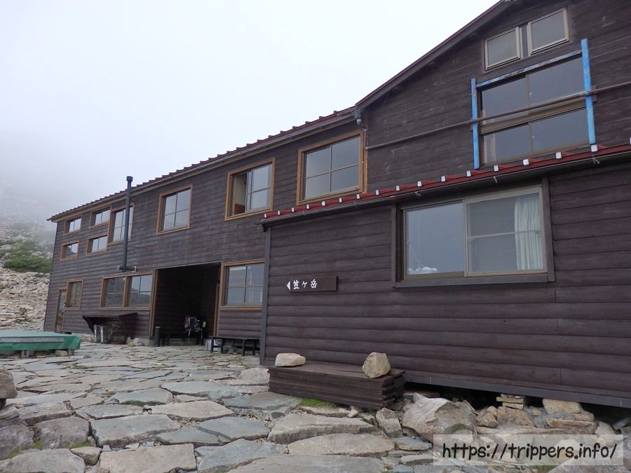 笠ヶ岳山荘の目の前までやって来ましたが、曇ってて山荘が見えません。