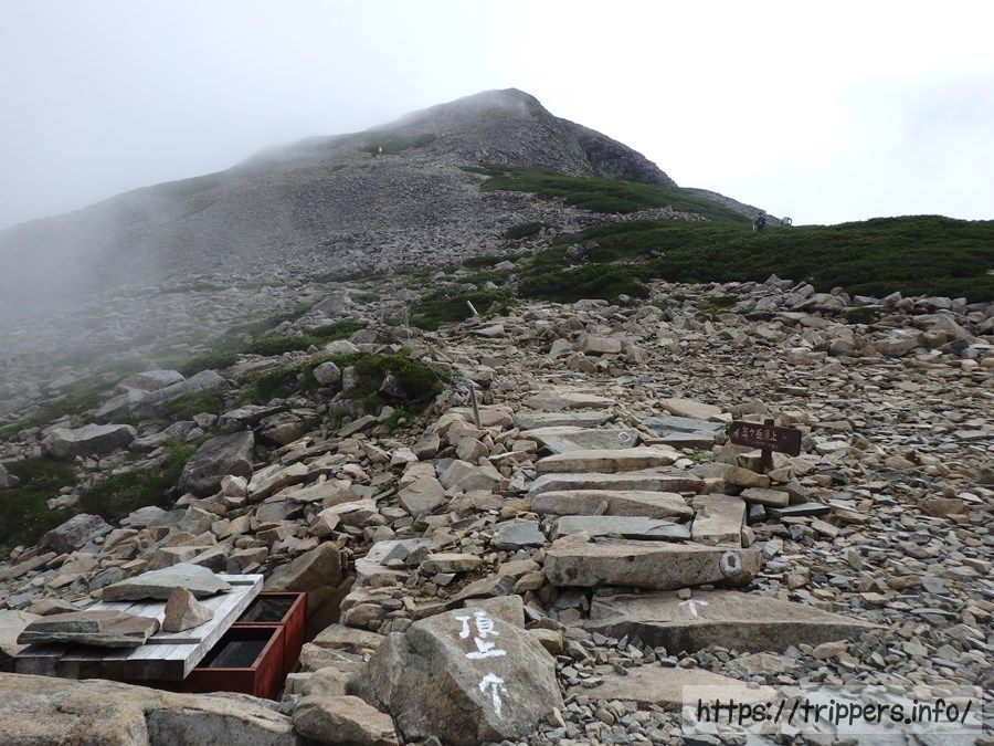 笠ヶ岳山荘から笠ヶ岳山頂へ目指します。天気はもうお手上げ状態の曇りなので、山頂からの景色は既に諦めていますが、行かずには下山できない。