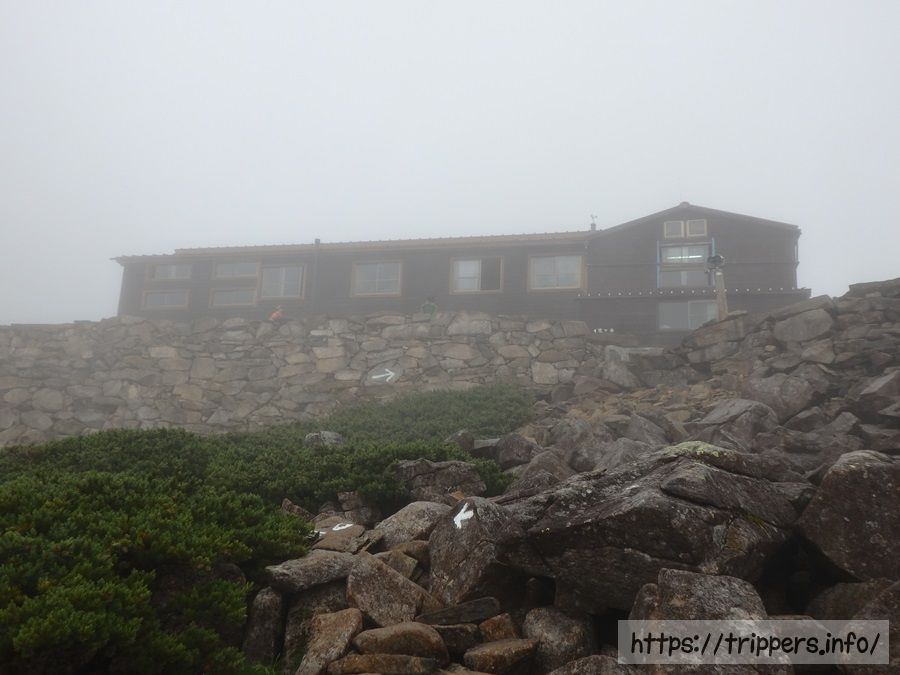 こうして、笠ヶ岳山荘とはお別れ... 振り返ると... 曇っててもっと前から山荘が見えへん!既にサヨナラし終わってました。