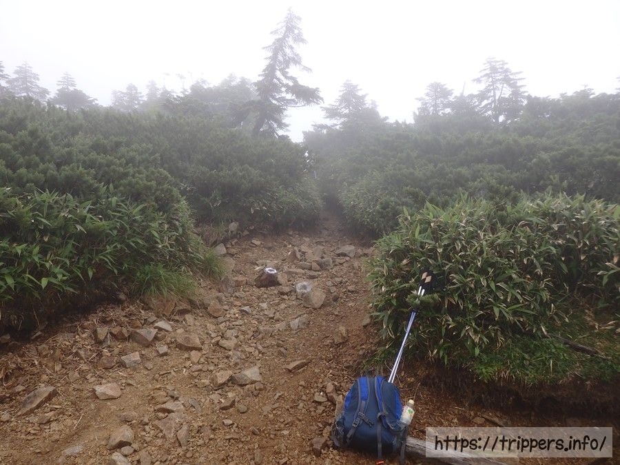 7:58に杓子平に到着しました。私の装備品と一緒に撮影。他の人のリュックよりも明らかに小さい。ここまで下りも結構急で、トレッキングポールなかったら困りものでした。私の手足が短いからです。