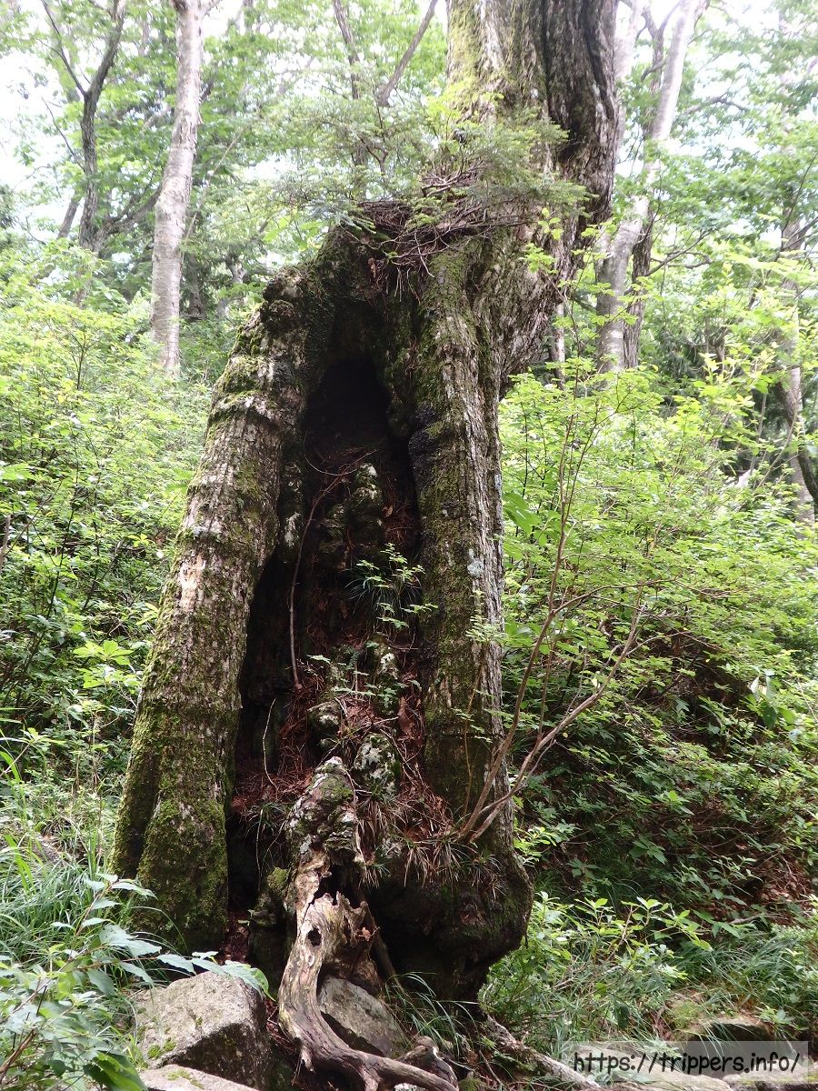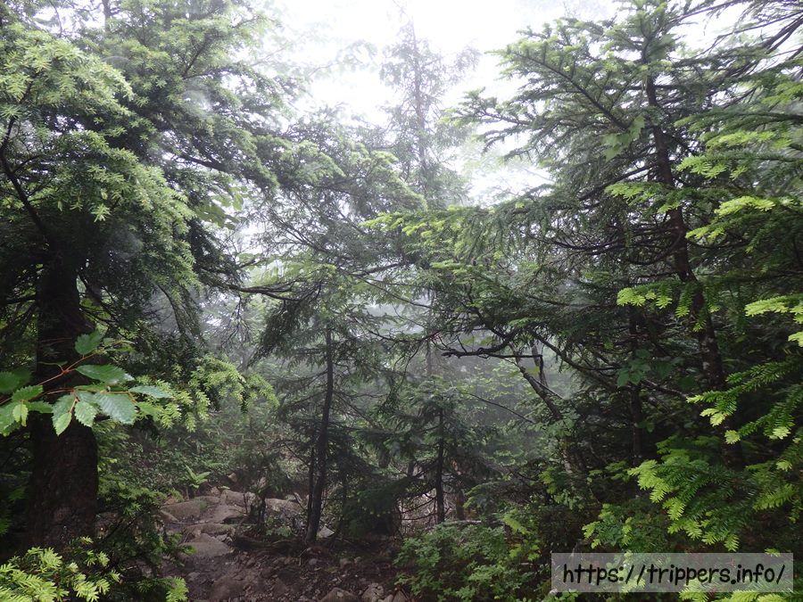笠新道登山口に近づくにつれ再び晴れてきました。日焼けした腕が再びチリチリしてきます。木々と苔に囲まれた登山が終盤だと思うと感慨ですが、足が... 足が...