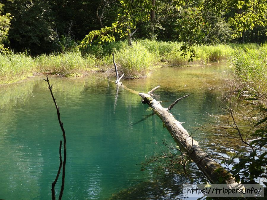 弁天沼の端っこです。風が少なく、水位もないため水の色が分かりやすいです。沼に浸かった倒木が味わいを出すと同時に水が澄んでいる事が分かります。