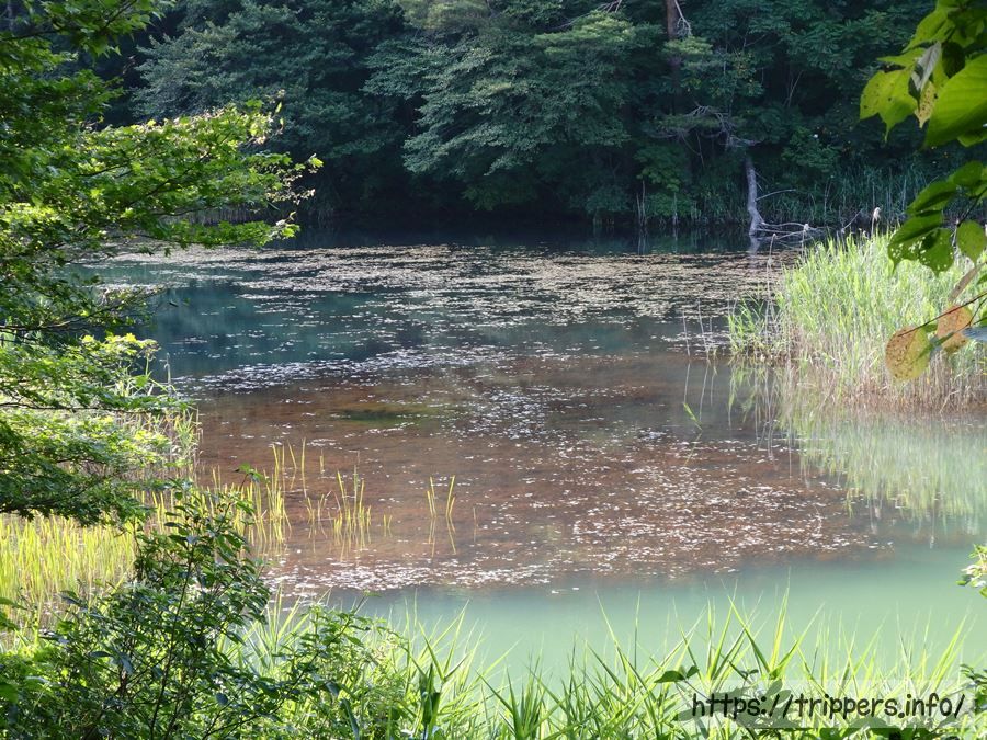 1つの沼で手前と奥で色が違っていました。探勝路の両側とも草木が多く、みどろ沼の側にある龍沼は見えませんでした。