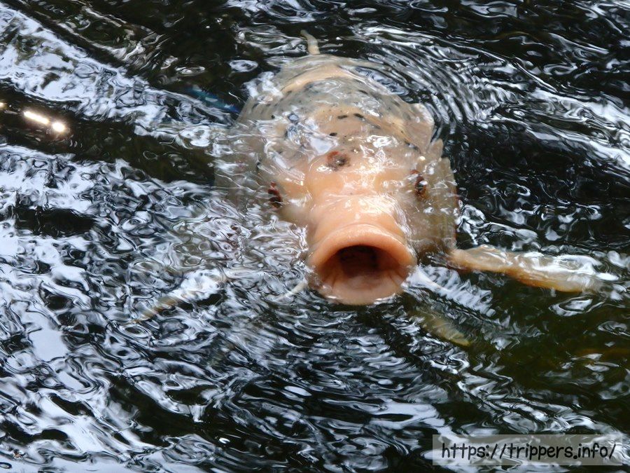 五色沼はハートのマークが身体にある鯉がいる事で有名のようですが、見つからず。代わりに口を大きく開けこちらに向かってアピールする大きな鯉が泳いでいました。