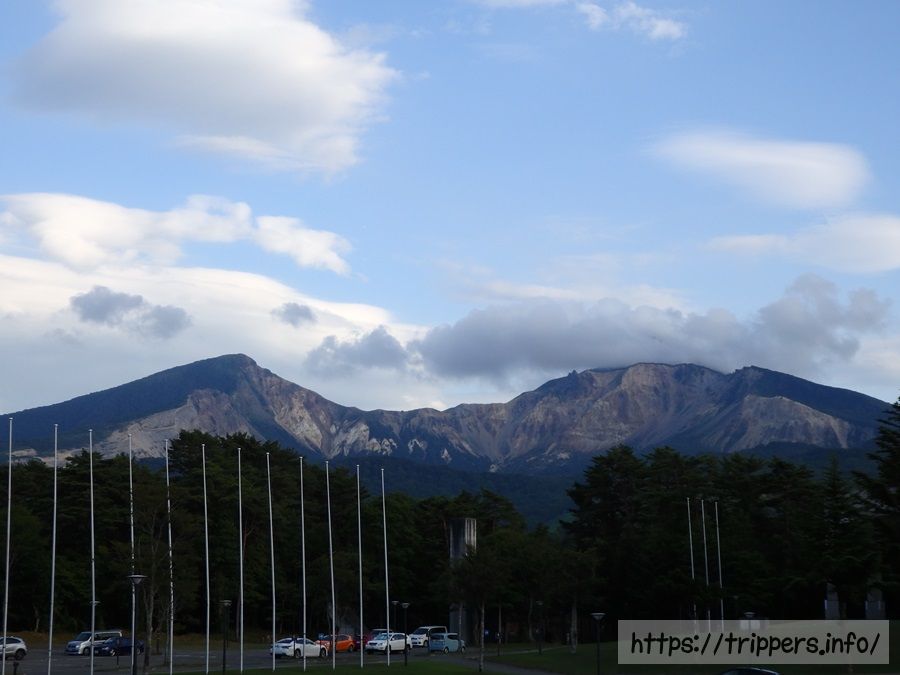 ホテルから見た磐梯山。山頂が雲に隠れてしまっています。明日山頂がガスりませんように!