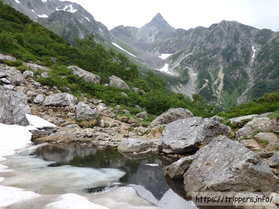 初めての槍ヶ岳登山は初心者コースで目指します。槍ヶ岳から標高3,000m以上ある稜線を南岳まで縦走し、融雪が進む天狗池で逆さ槍を観賞します。下山後は上高地の大正池まで歩いて観光します。