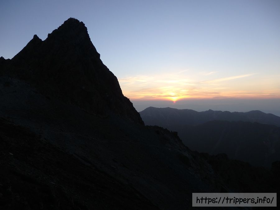 翌朝は薄い雲に太陽が隠れながらも、日の出を拝む事ができました。逆光でシルエット姿になった槍ヶ岳の穂先も迫力があります。日の出と朝食開始時間が被るため、日の出を見終えると早々と山荘へ戻っていく人が多かったです。