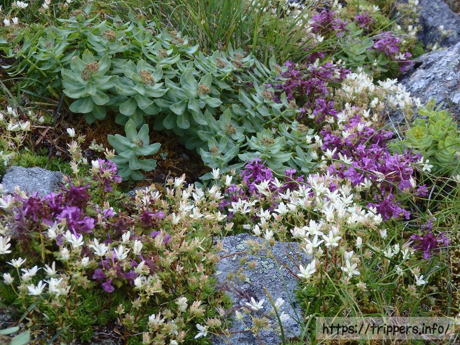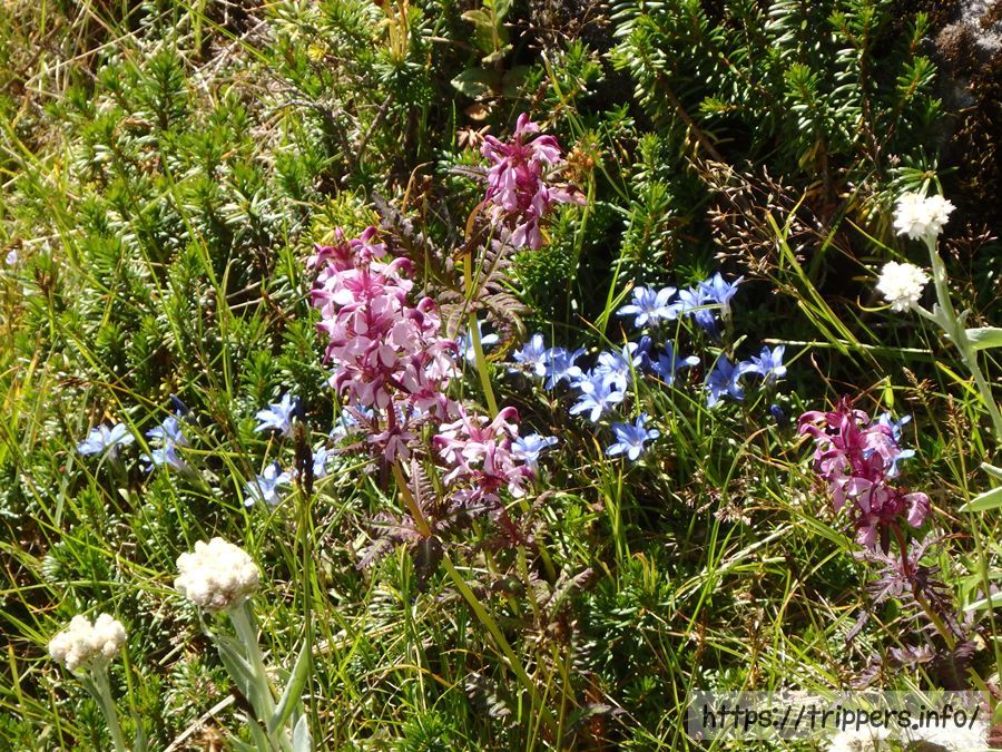 ヨツバシオガマ(紫)とミヤマリンドウ(青)、タカネヤハズハハコ(白)がコラボレーションしてました。