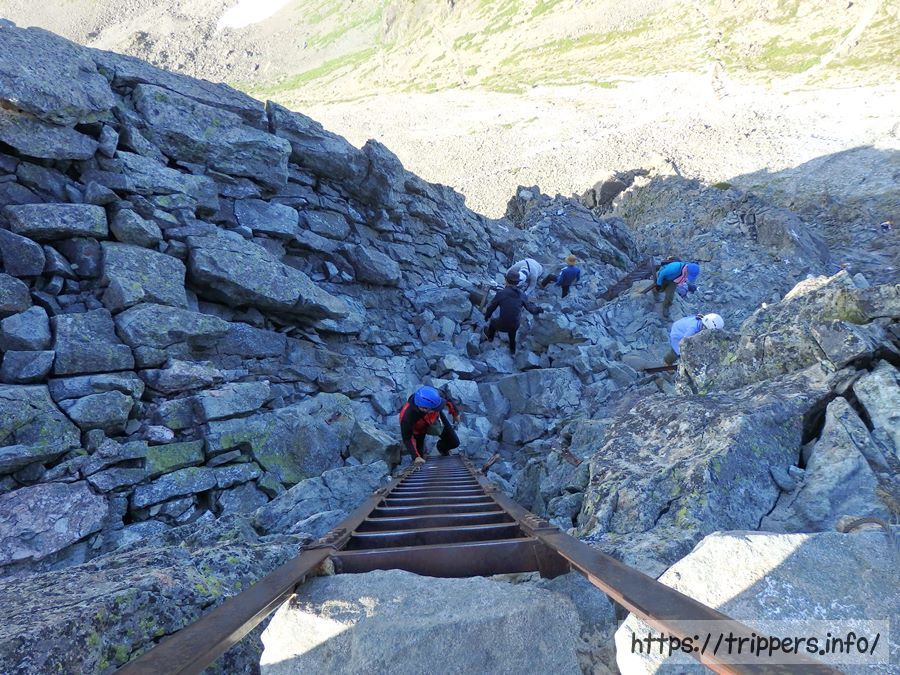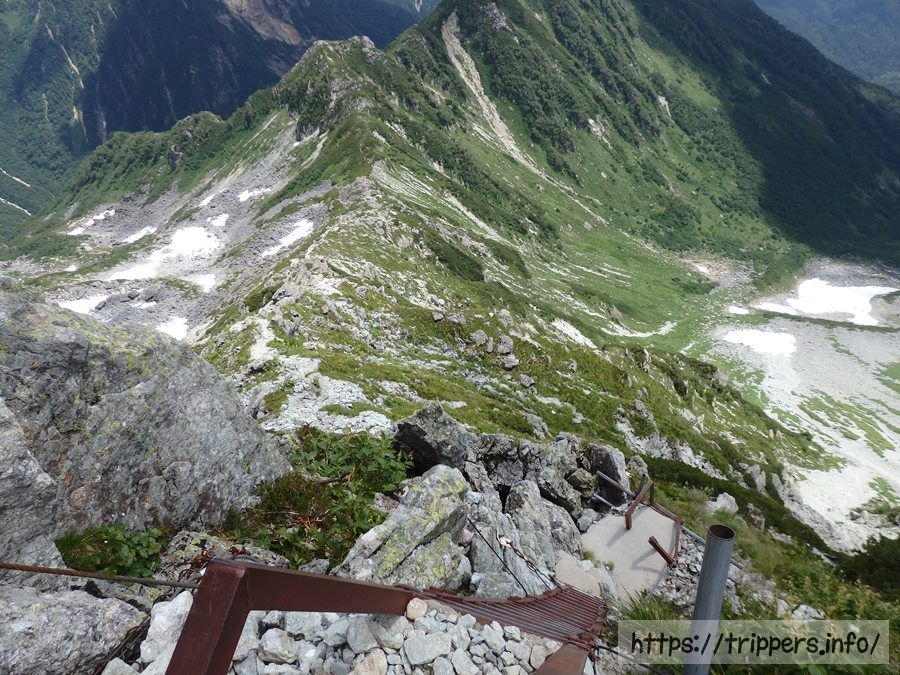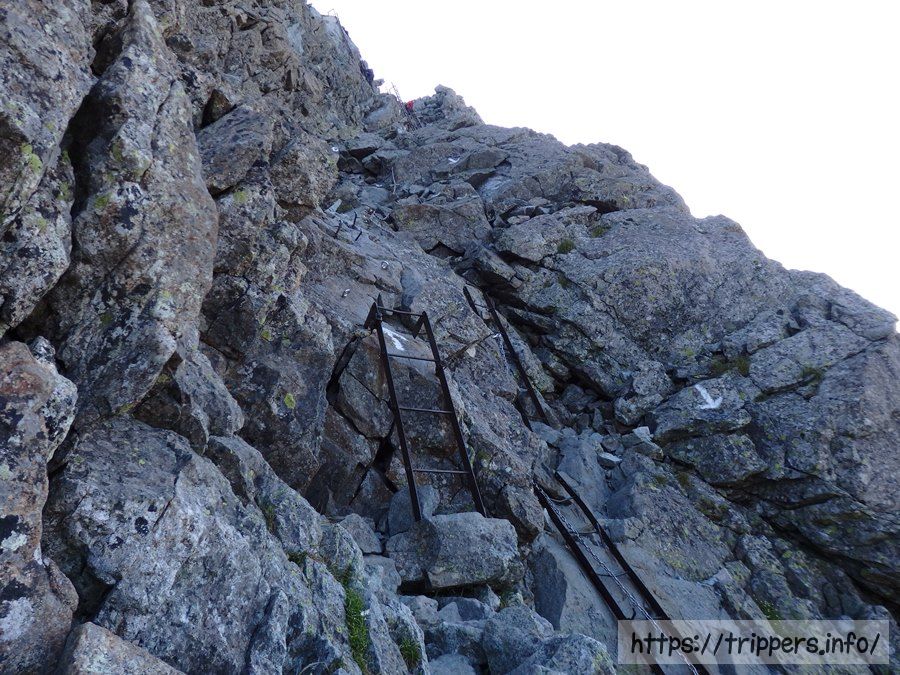 二段ハシゴを登れば中岳に到着です。槍ヶ岳の穂先のハシゴと比較すれば怖さはなかったです。ただ、今回初めて大きいリュックを背負っており、重心が重心が取りずらいため、油断は禁物でした。