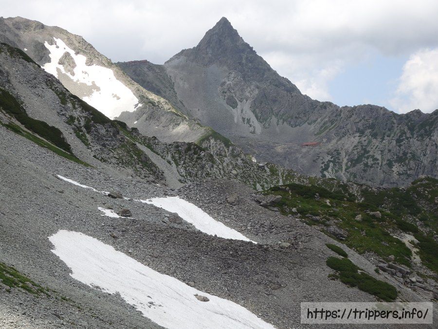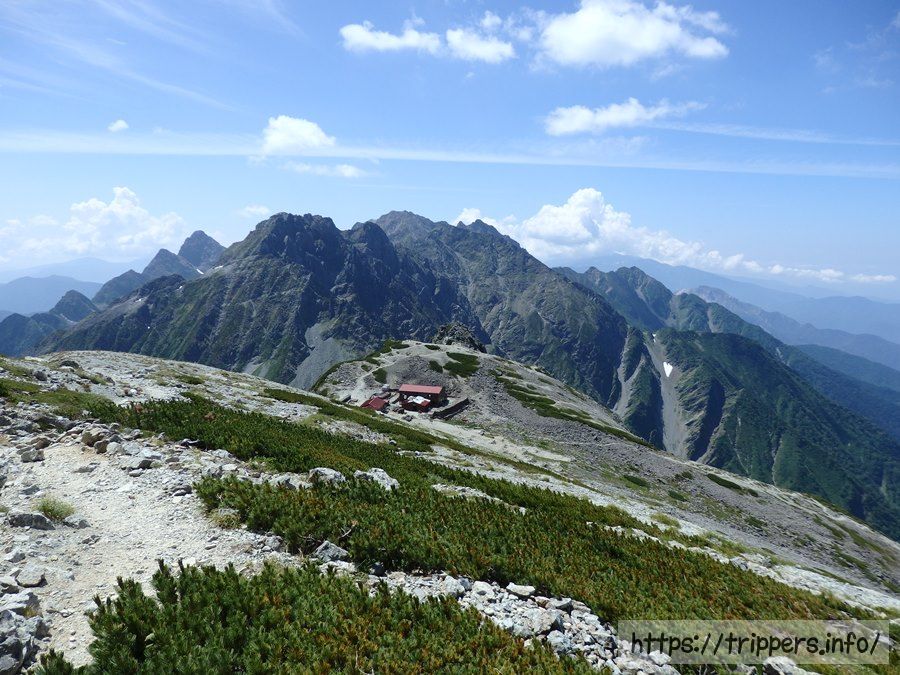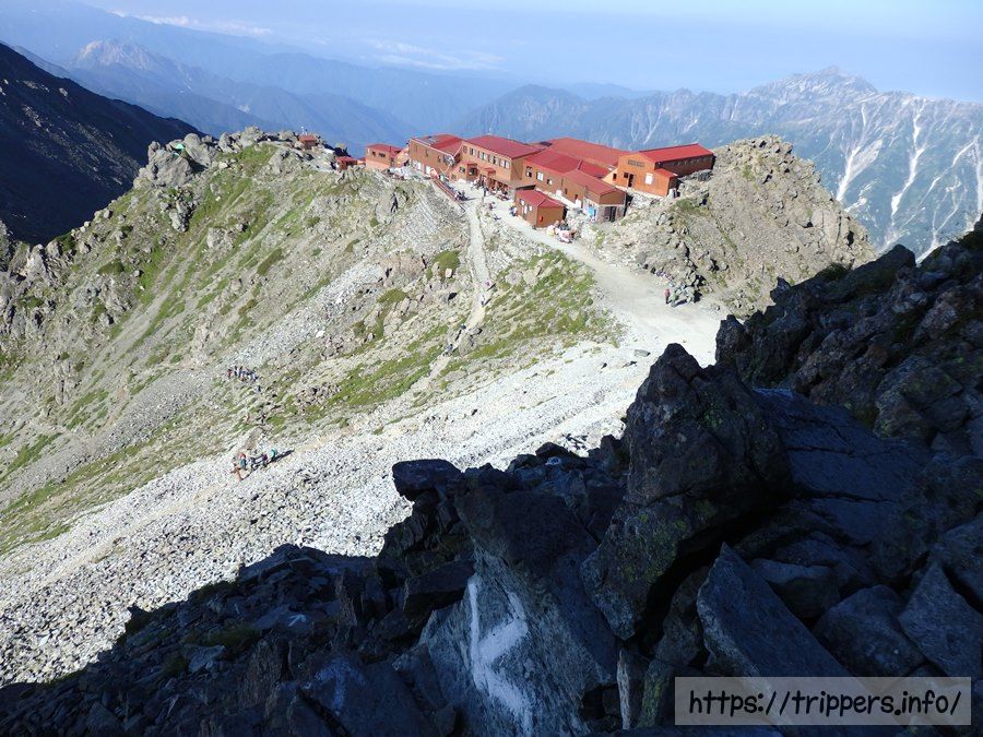 目の前に見えるのが南岳小屋です。奥に見える北穂高岳はいつか大キレット通過してみたいような、そこまでしなくても良いような。高度感あって怖いのは体も心も拒否。