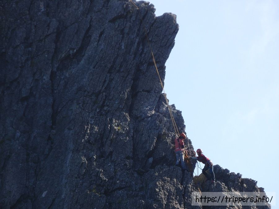 登山用語をほぼ知らないのですが、これがいわゆるトラバースって事ですね。普段背負っているリュックは小さいので今まで思った事ないのですが、背負っている大きなリュックが壁に当たって体が外に押し出されて滑落しないかとか、リュックによって重心が崩れて滑落しないかとか頭によぎります。